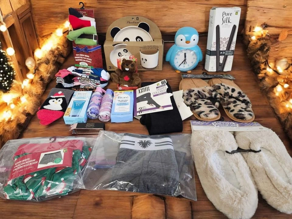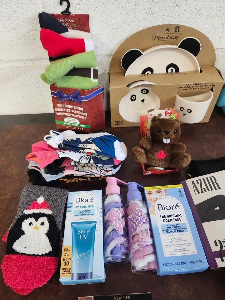 Socks and Slippers: Various pairs of socks, some with Christmas themes like a penguin, and a pair of leopard print fuzzy slippers and plain beige slippers are visible.