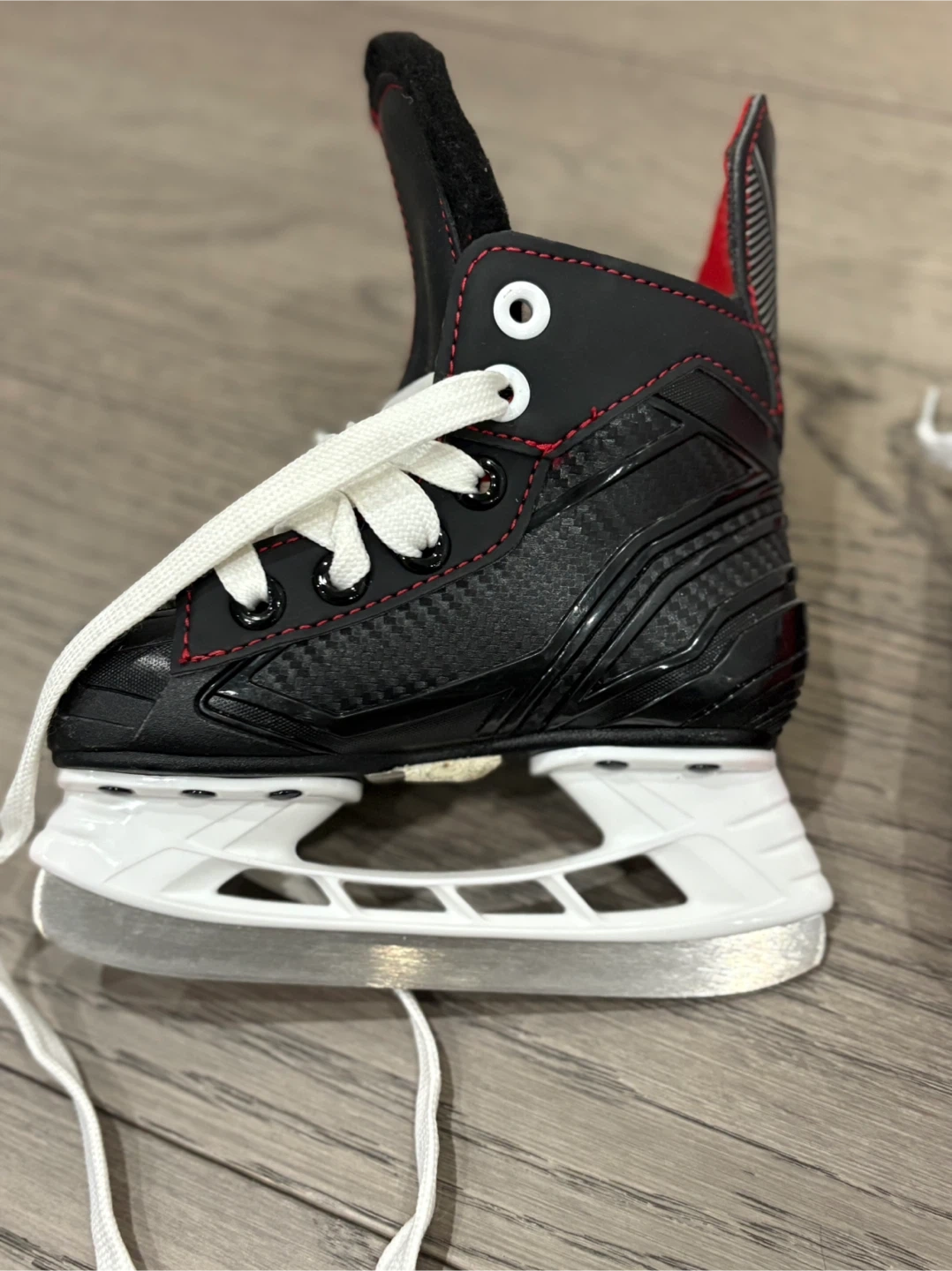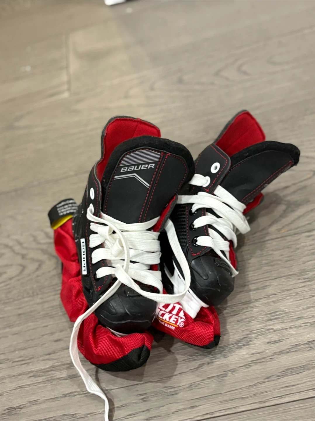 Selling a pair of Bauer hockey skates in size 2.5. They are black with red accents and white laces. Great for getting out on the ice!
