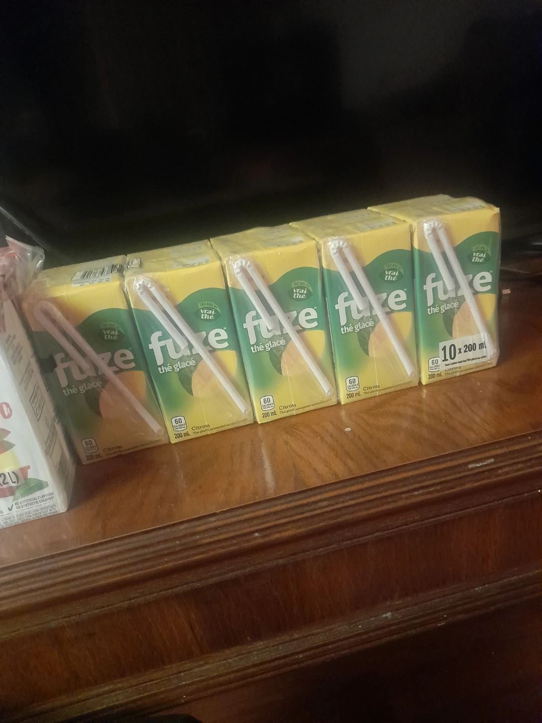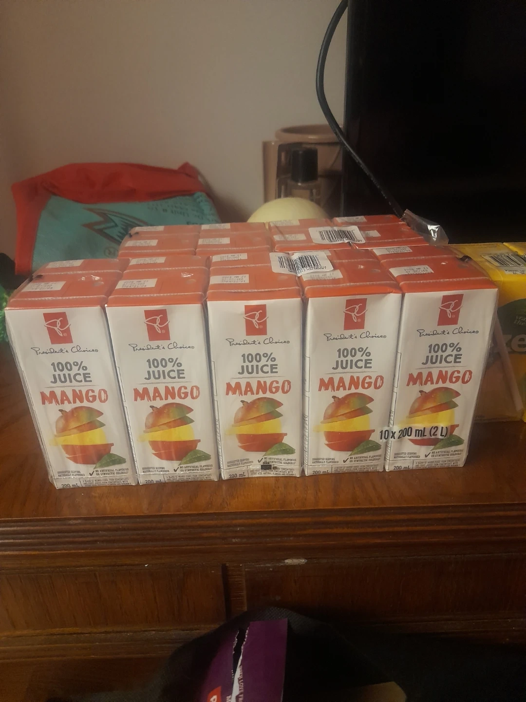 Selling a mix of juice boxes! There are President's Choice 100% Mango Juice boxes and Fuze Iced Tea boxes. Each pack contains 10 x 200mL boxes. Perfect for school lunches or a quick refreshment!
