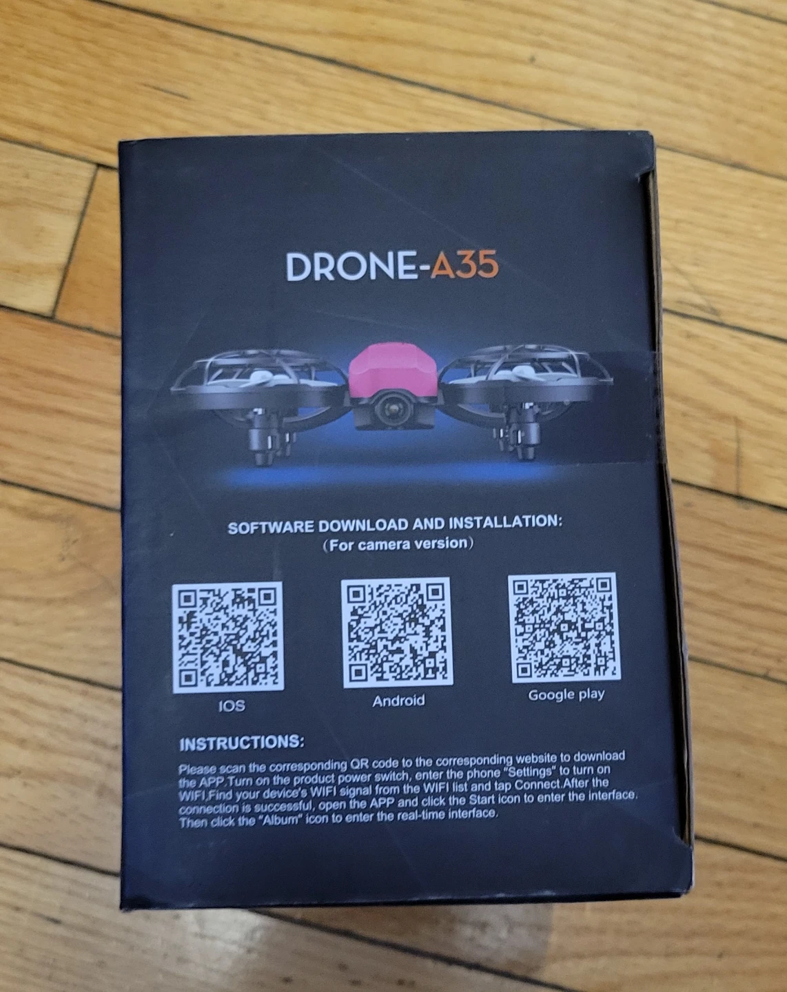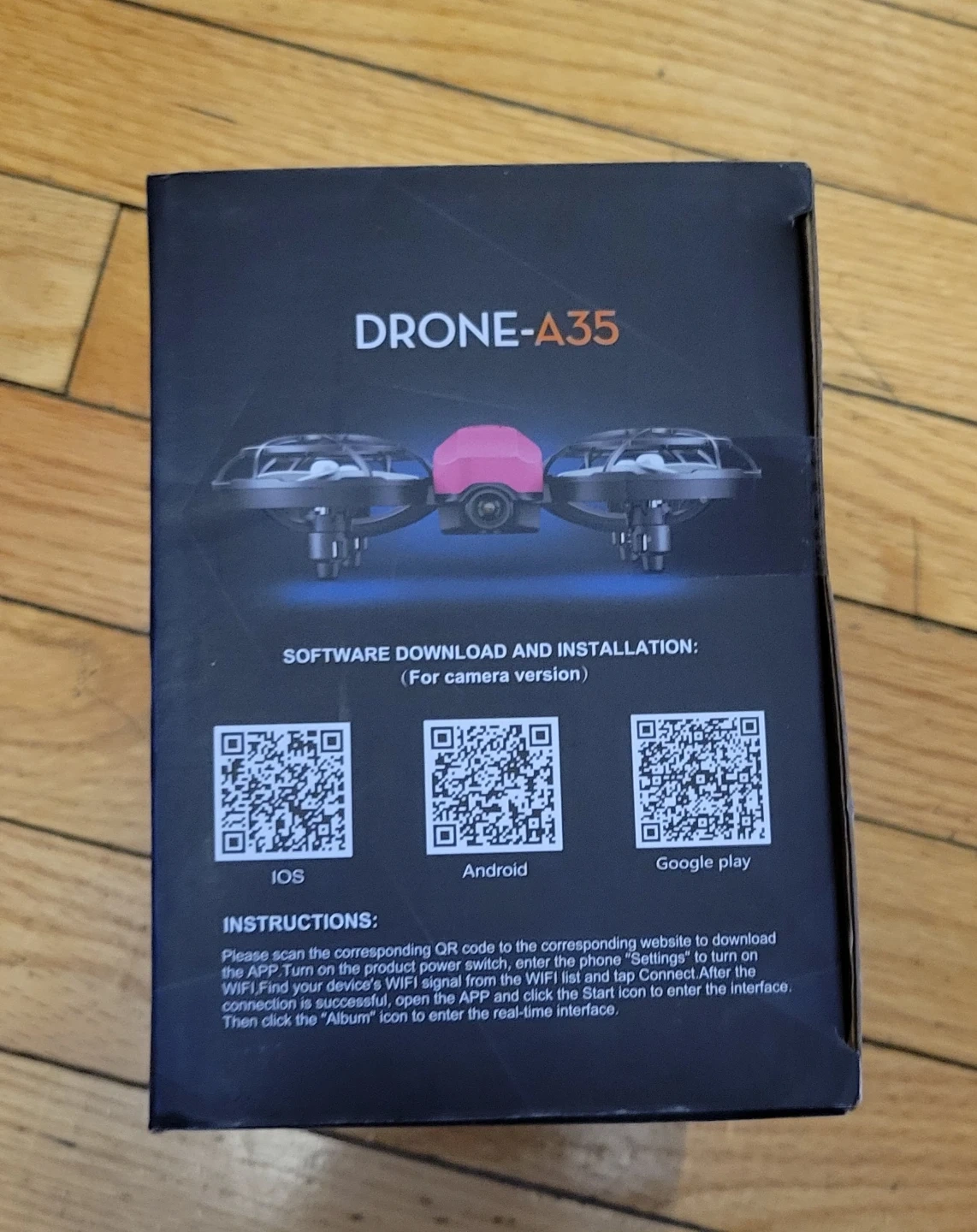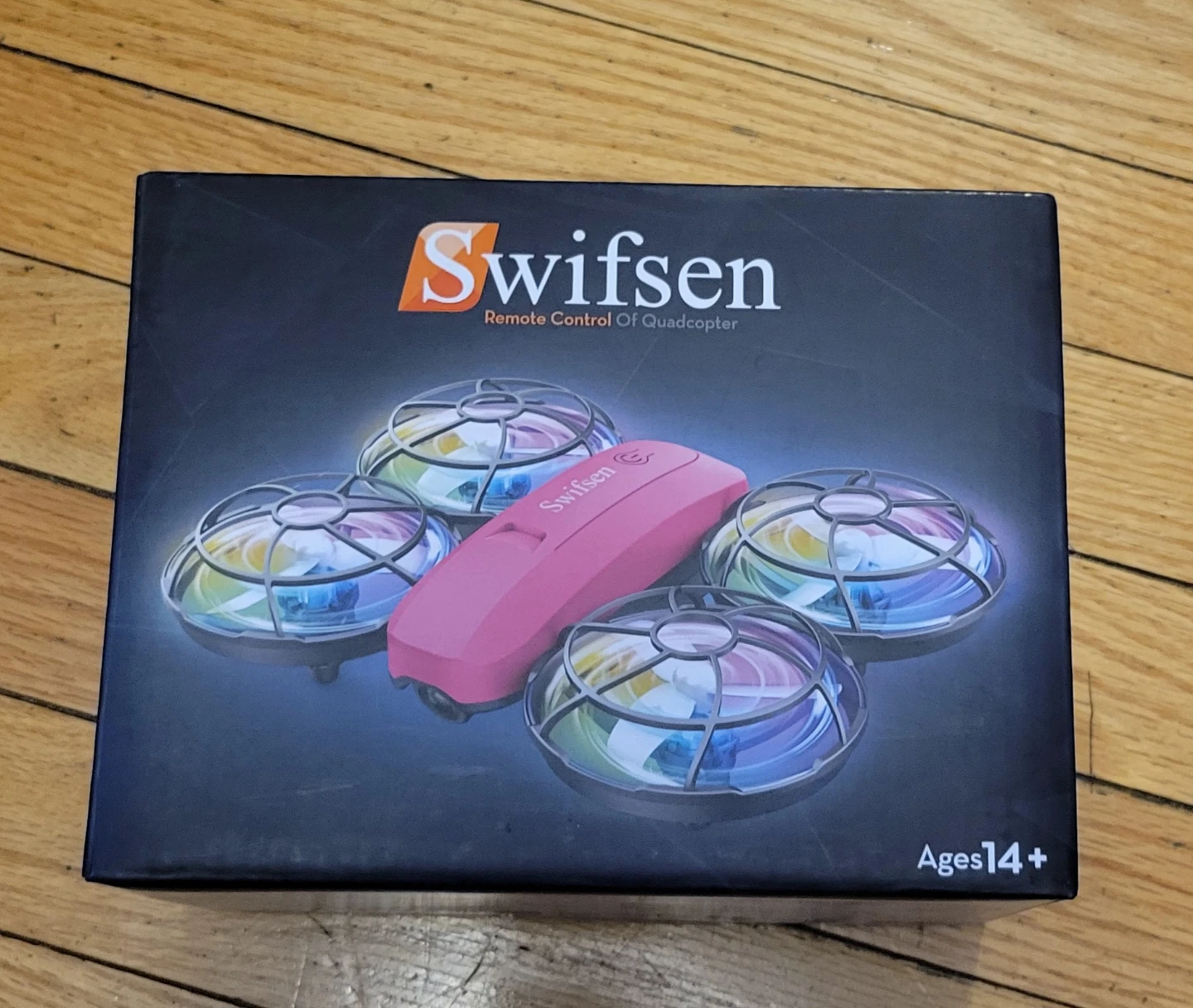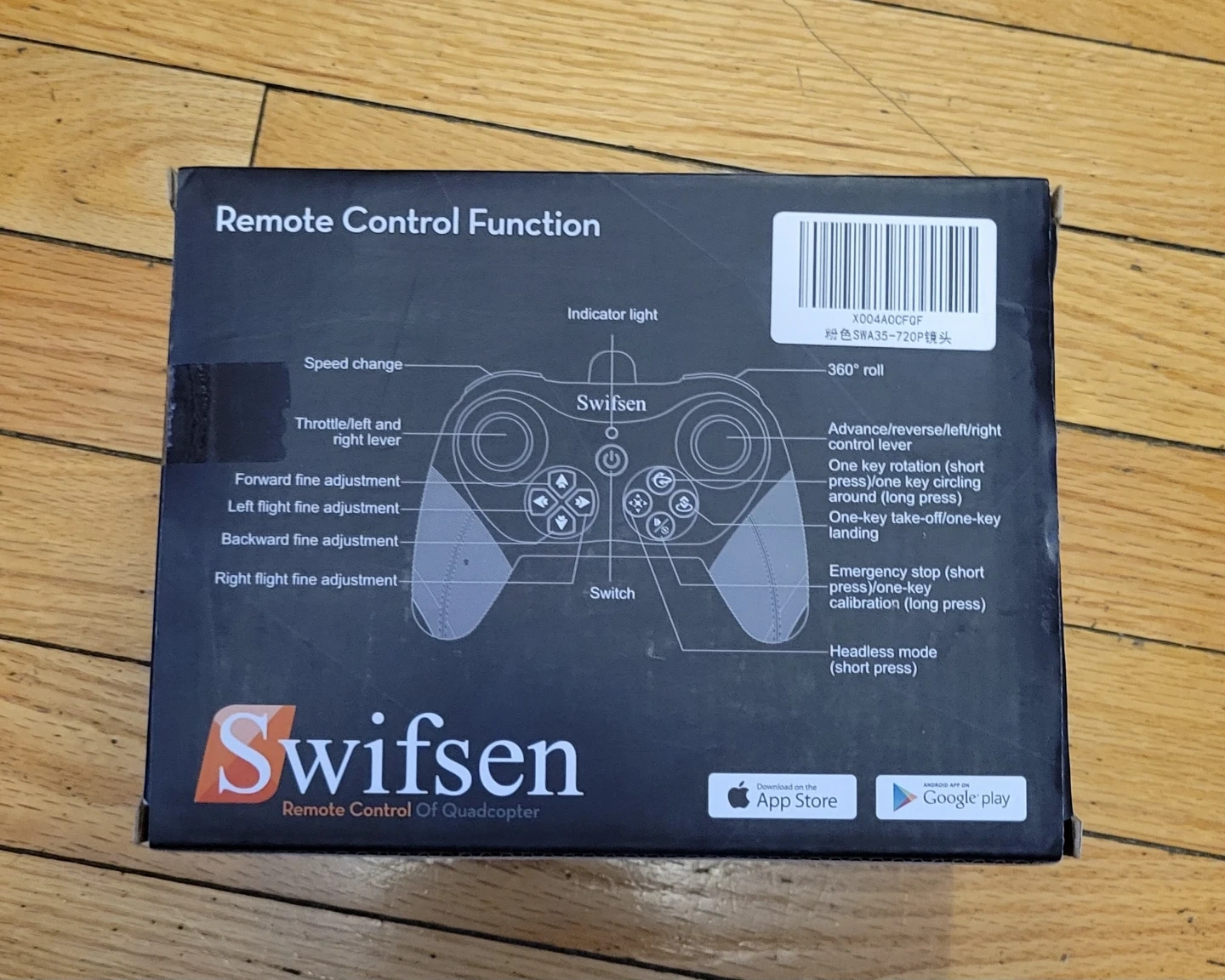 Selling a Swifsen Remote Control Quadcopter Drone-A35. The box includes instructions and detailed diagrams for the remote control functions. It's designed for ages 14 and up. The drone features one-key take-off/one-key landing and headless mode.