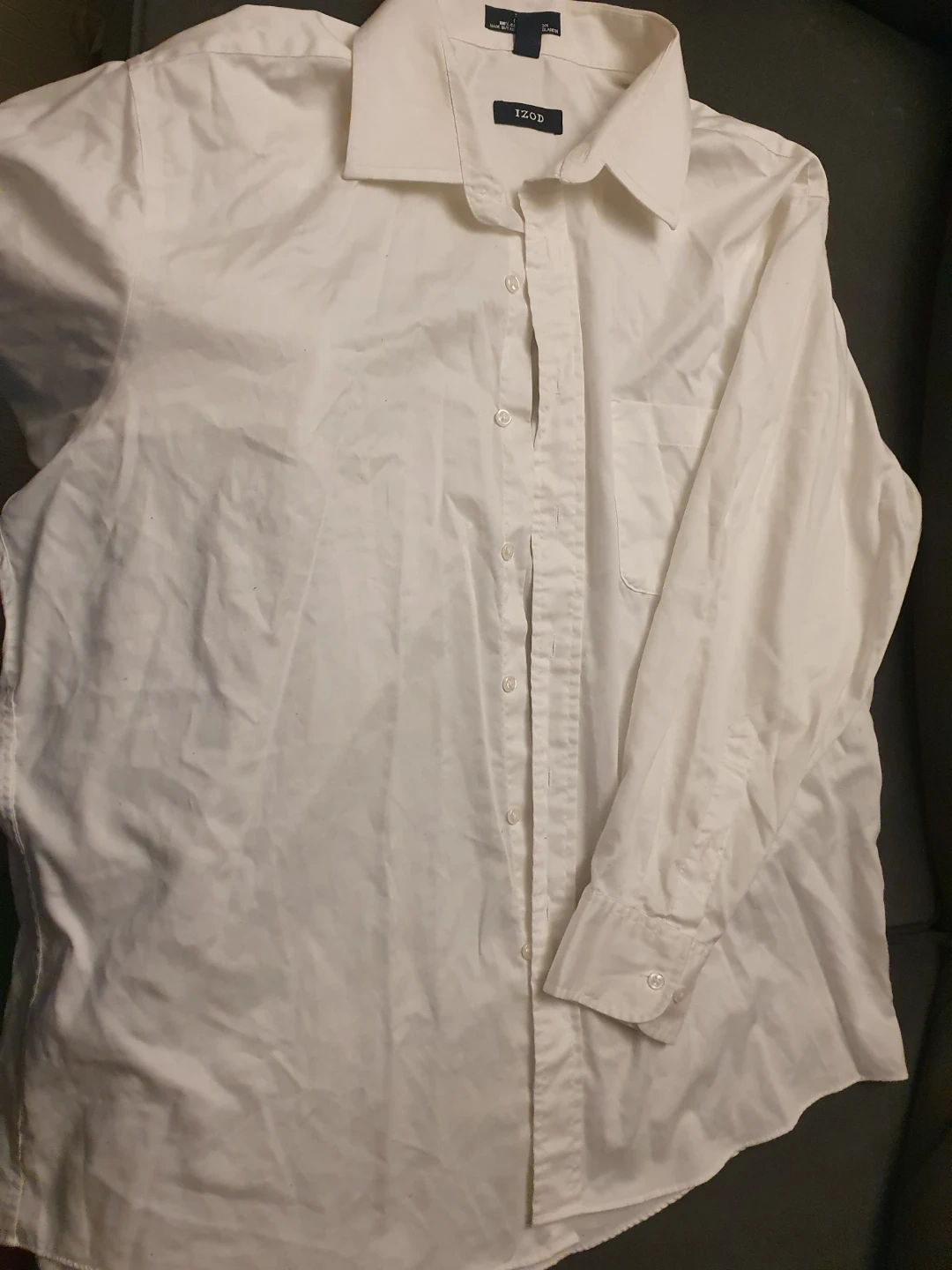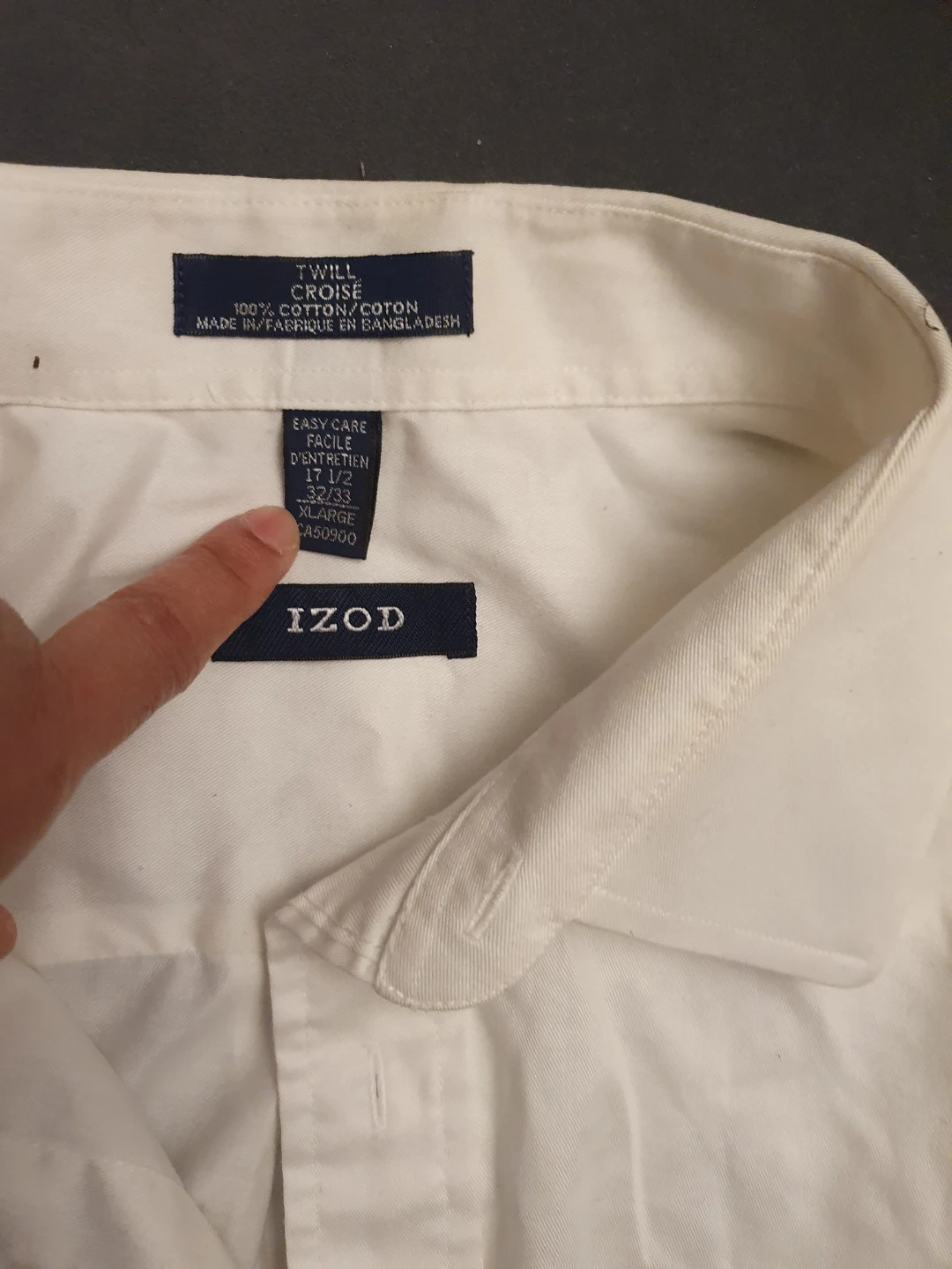 Selling an IZOD dress shirt in size XL. It's a crisp white colour and made from 100% cotton. It's in great condition!