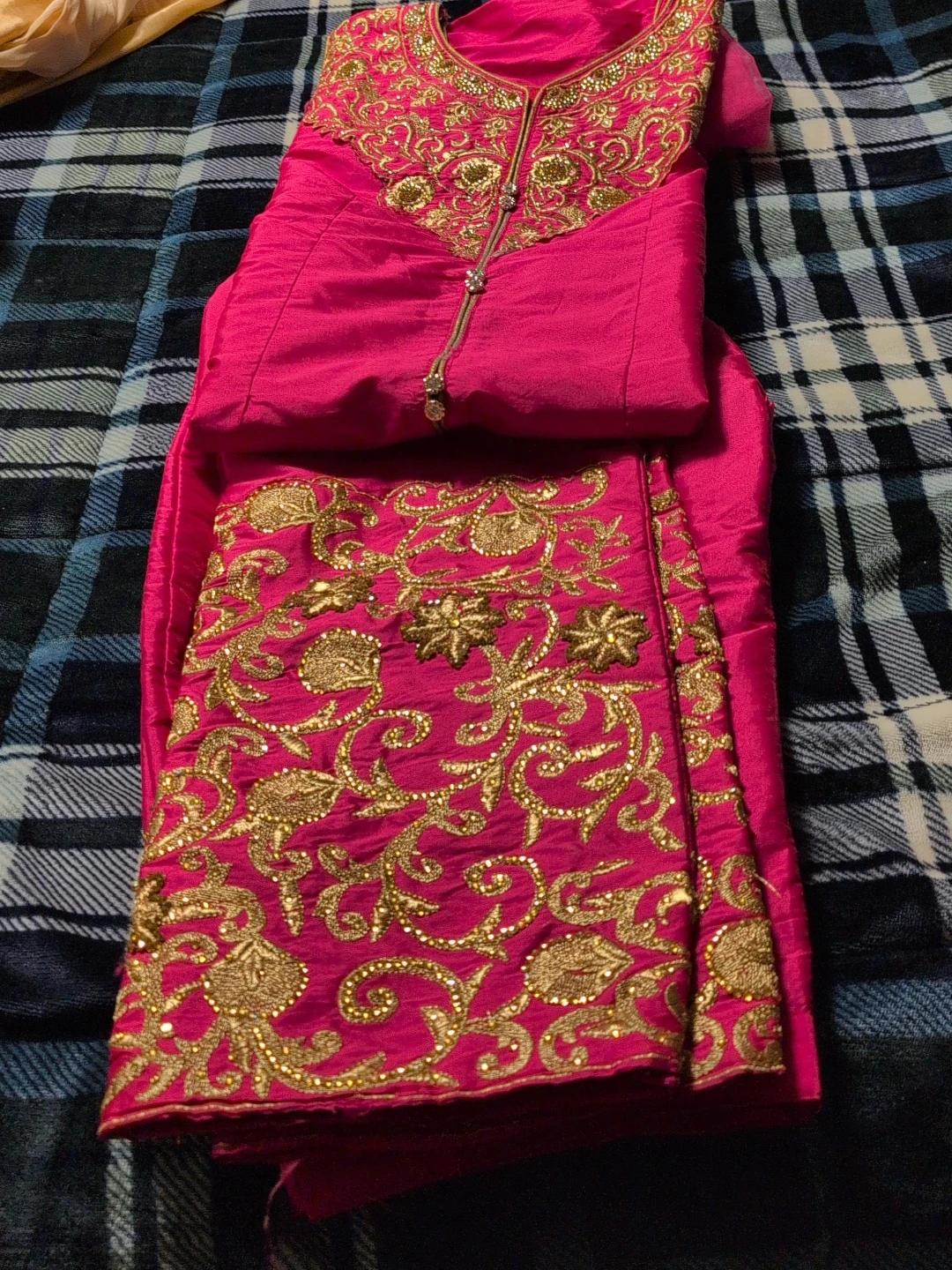 Selling a beautiful pink salwar kameez with intricate gold embroidery. This set is perfect for special occasions or adding a pop of colour to your wardrobe! The fabric has a lovely texture and the embroidery is very detailed