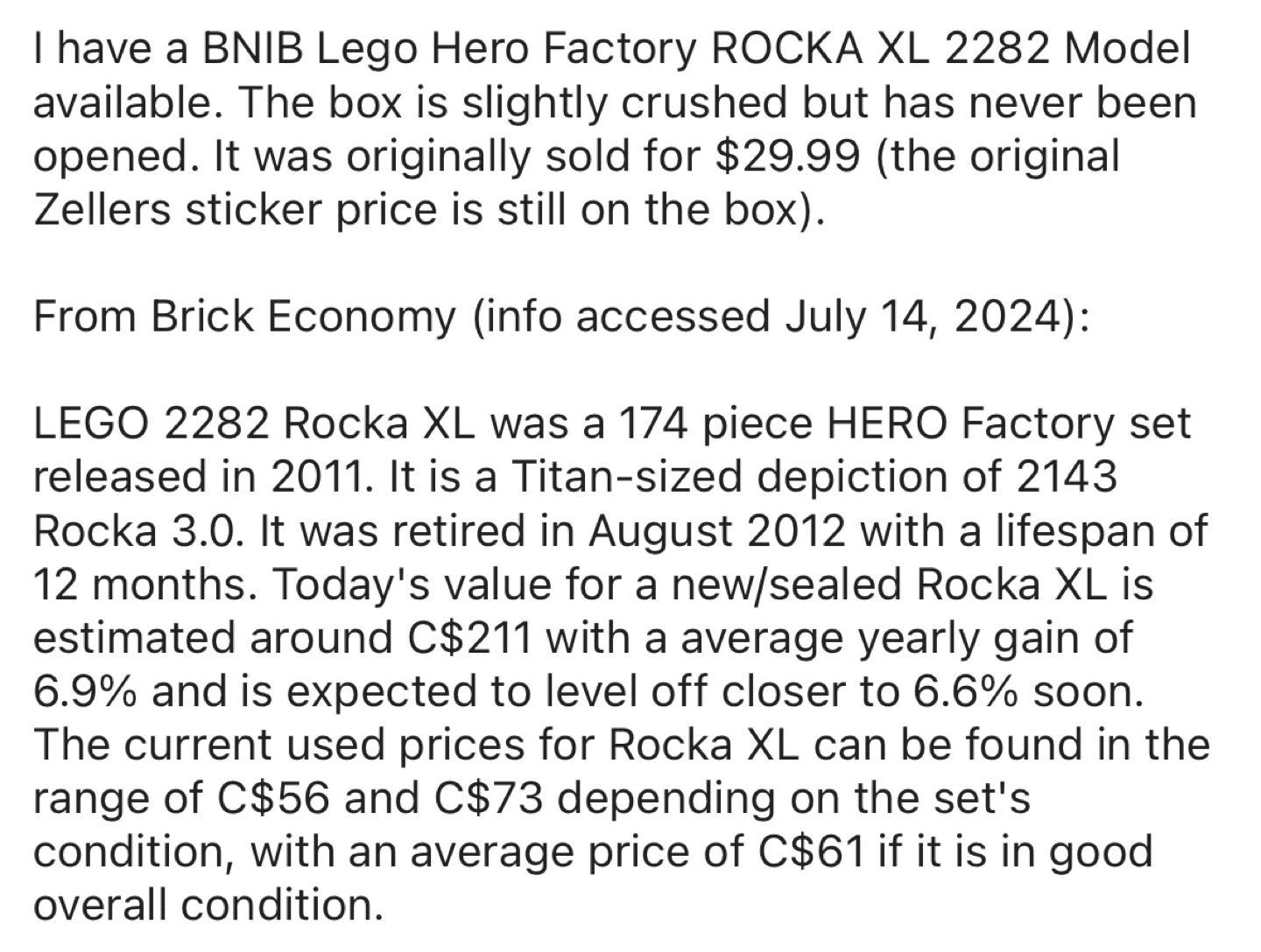 Selling a retired LEGO Hero Factory Rocka XL 2282 set! This set is BNIB though box shows some wear. It originally sold for $29.99 and is listed on Brick Economy used average at good condition $61. A great find for any LEGO enthusiast!