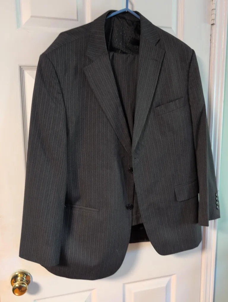 Selling a men's striped suit. It's in great condition and perfect for any formal occasion! The suit includes both the jacket and pants.