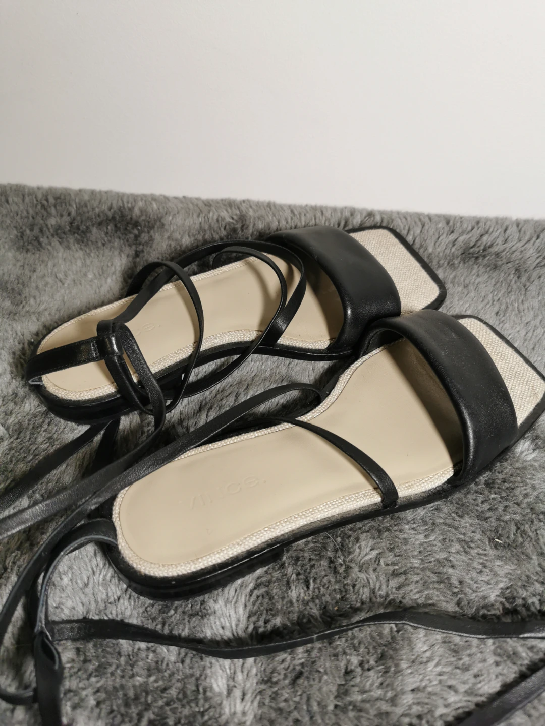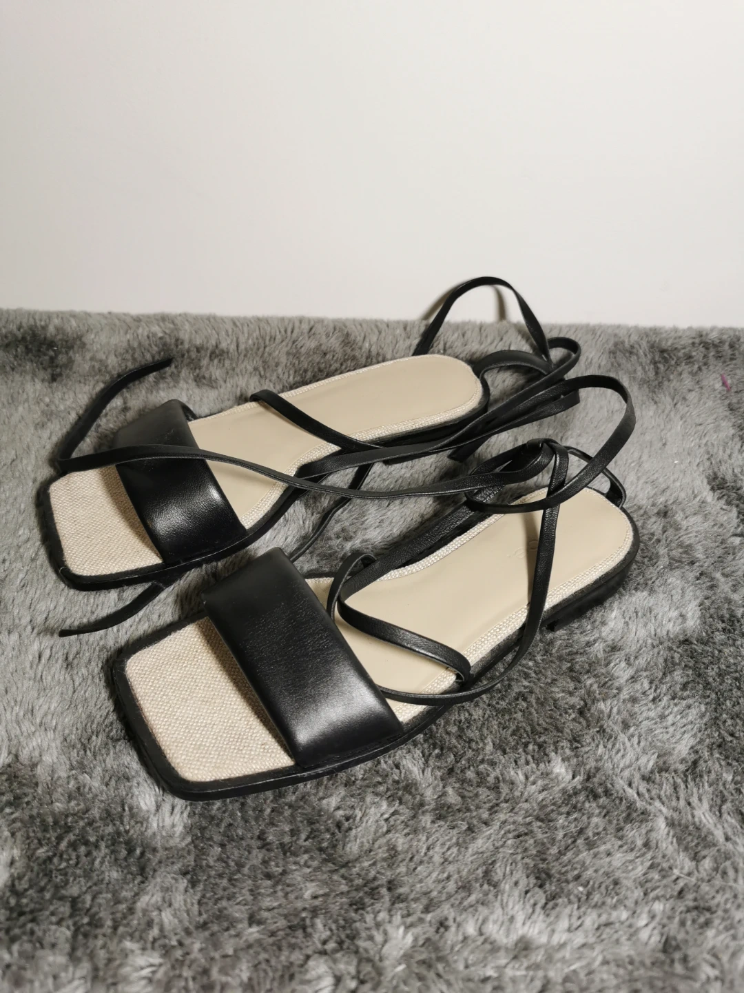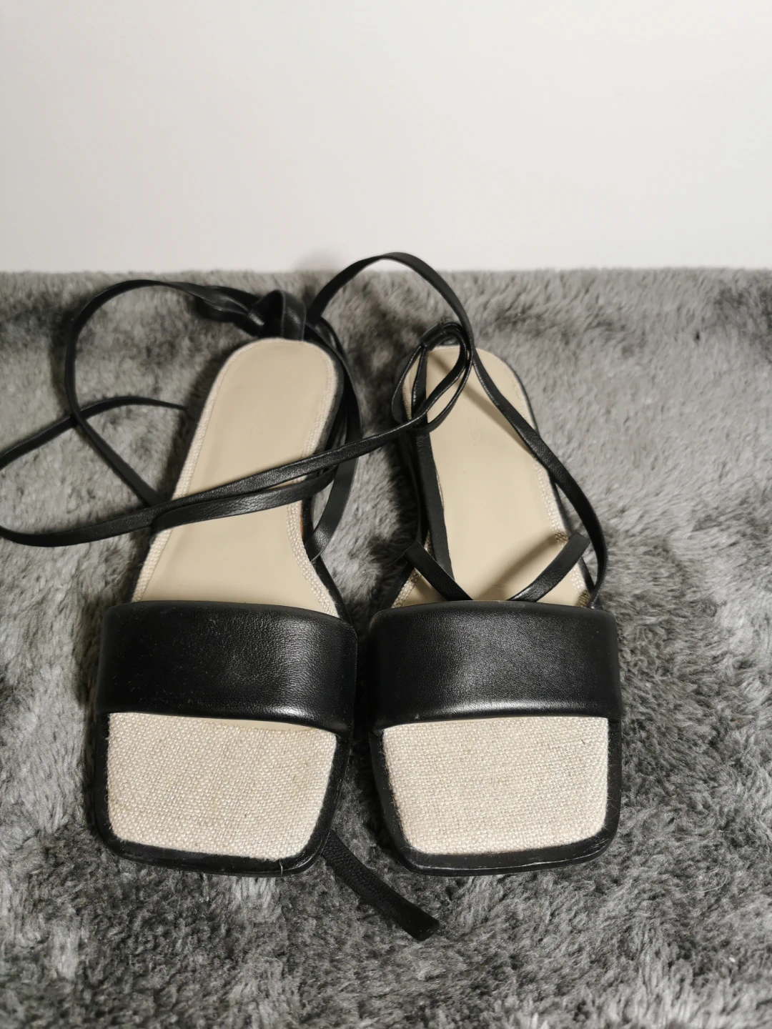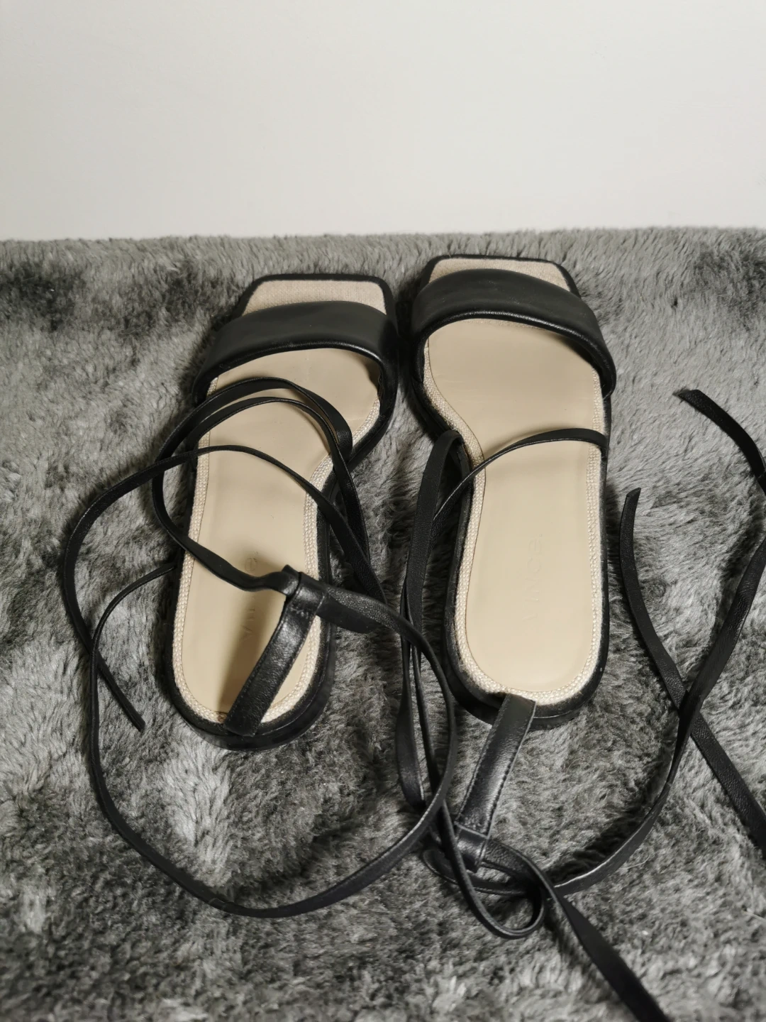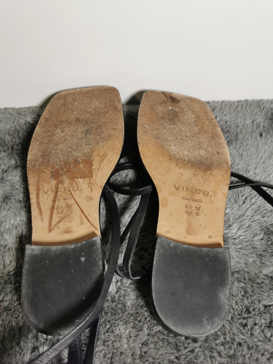 Selling a pair of Vince black leather wrap sandals in size 5. They have a stylish and minimalist design, perfect for dressing up or down. Please note they show signs of wear on the soles as pictured