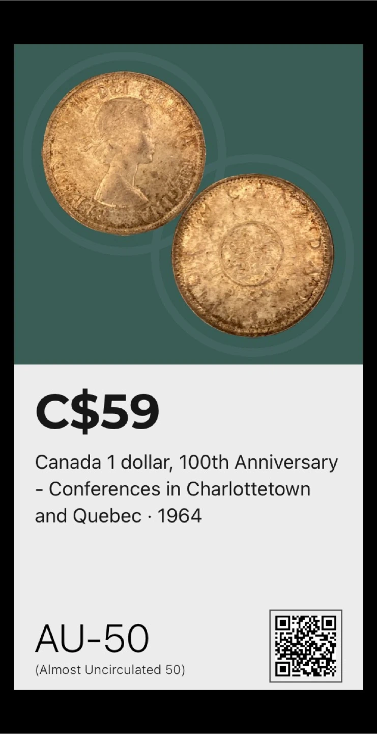 Selling a Canada 1 dollar coin commemorating the 100th Anniversary of the Conferences in Charlottetown and Quebec in 1964.