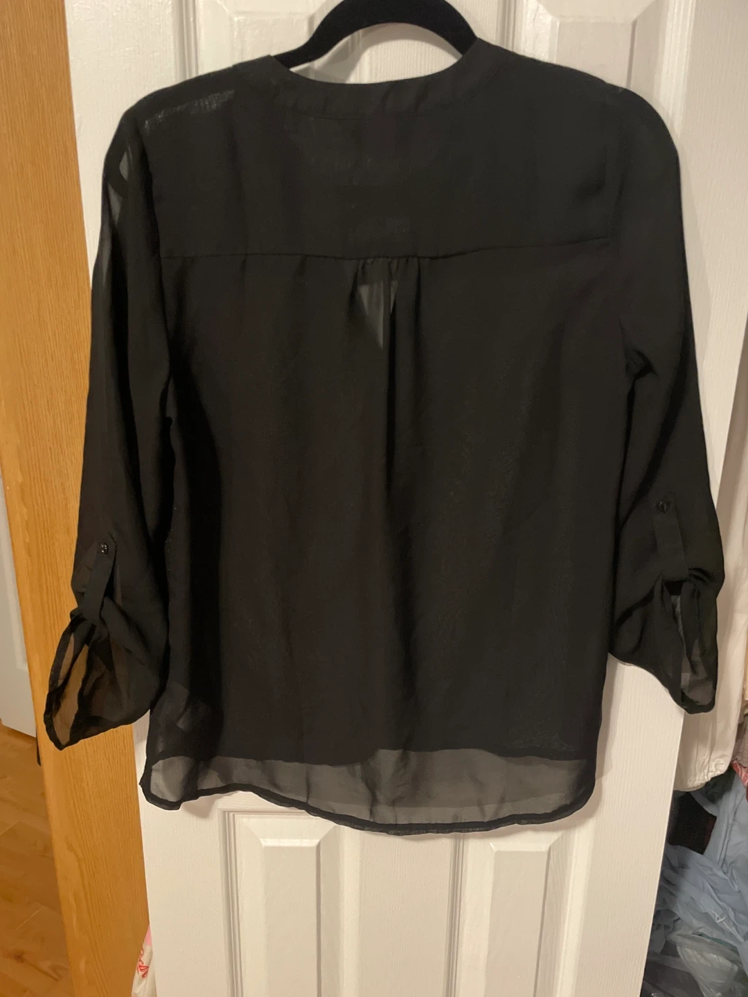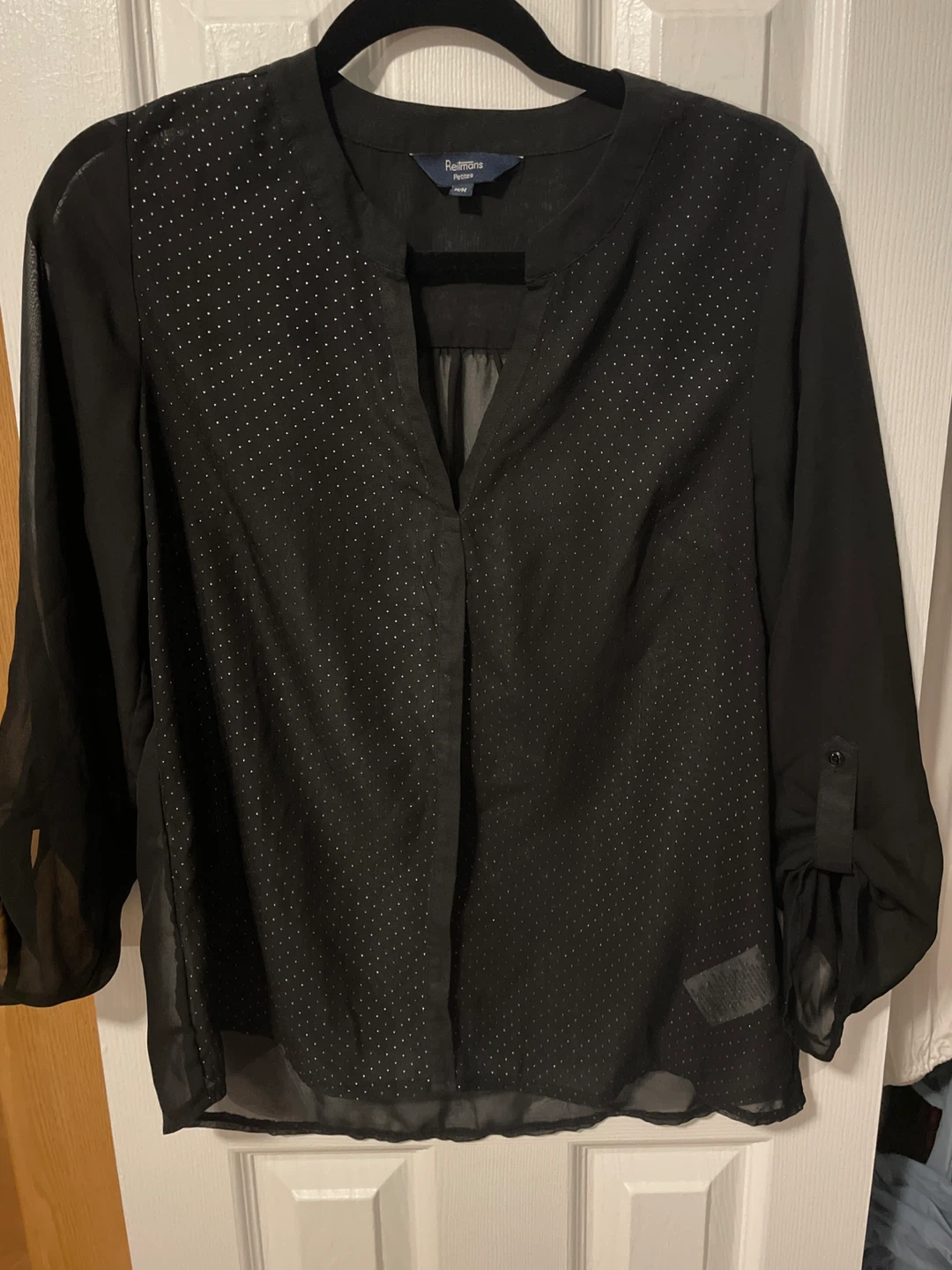 Giving away a Reitmans Petites black blouse in size M/M. It's in great condition and ready for a new wardrobe! The blouse features a stylish design with sheer details and roll-tab sleeves, perfect for a casual or dressy look.