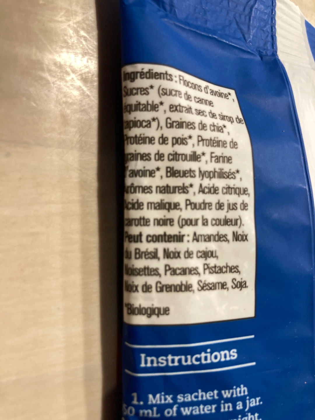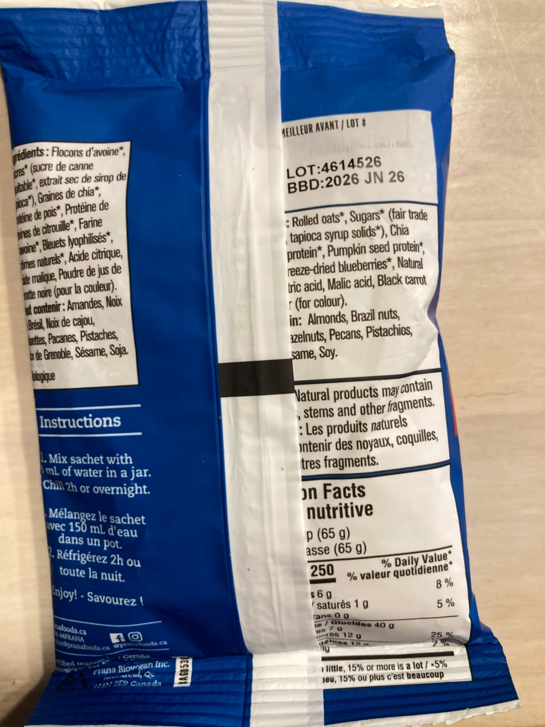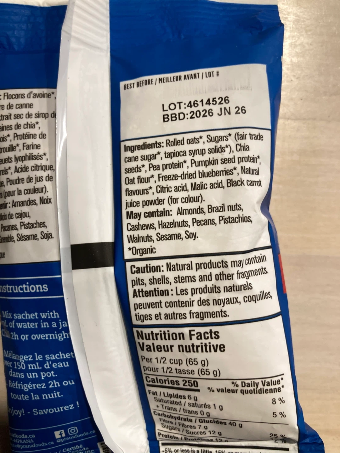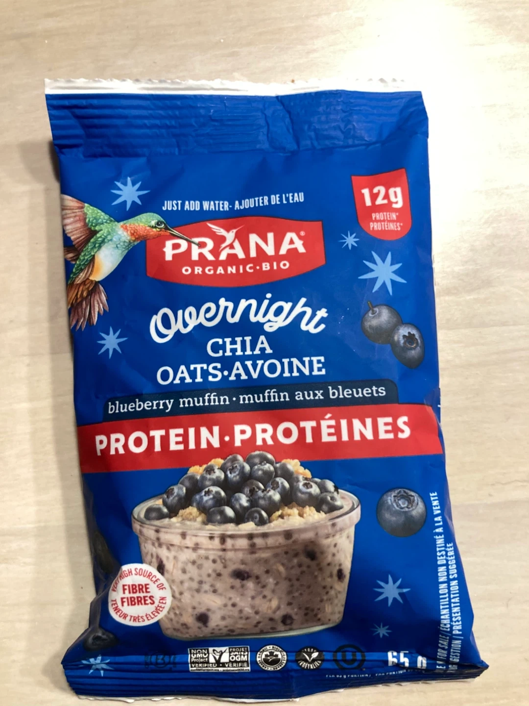 this is one unopened single serving package of: prana blueberry muffin flavour overnight chia protein oats. please say that 3 times fast!