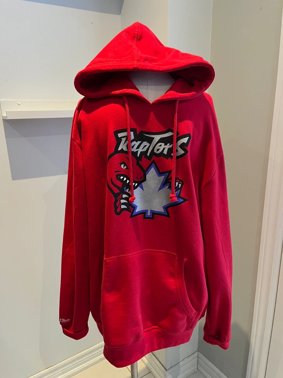 Selling a red Raptors hoodie from Mitchell & Ness! The hoodie features the classic Raptors logo with the dinosaur and maple leaf. It's in great condition and perfect for showing your team spirit around town or at the game!