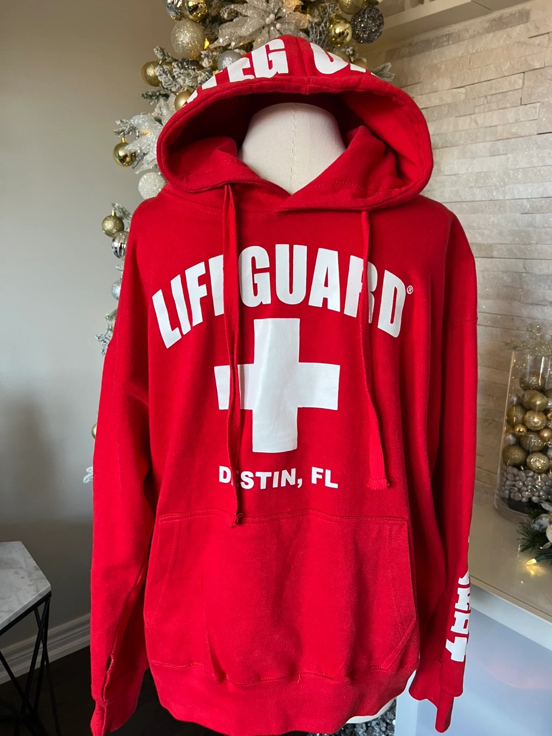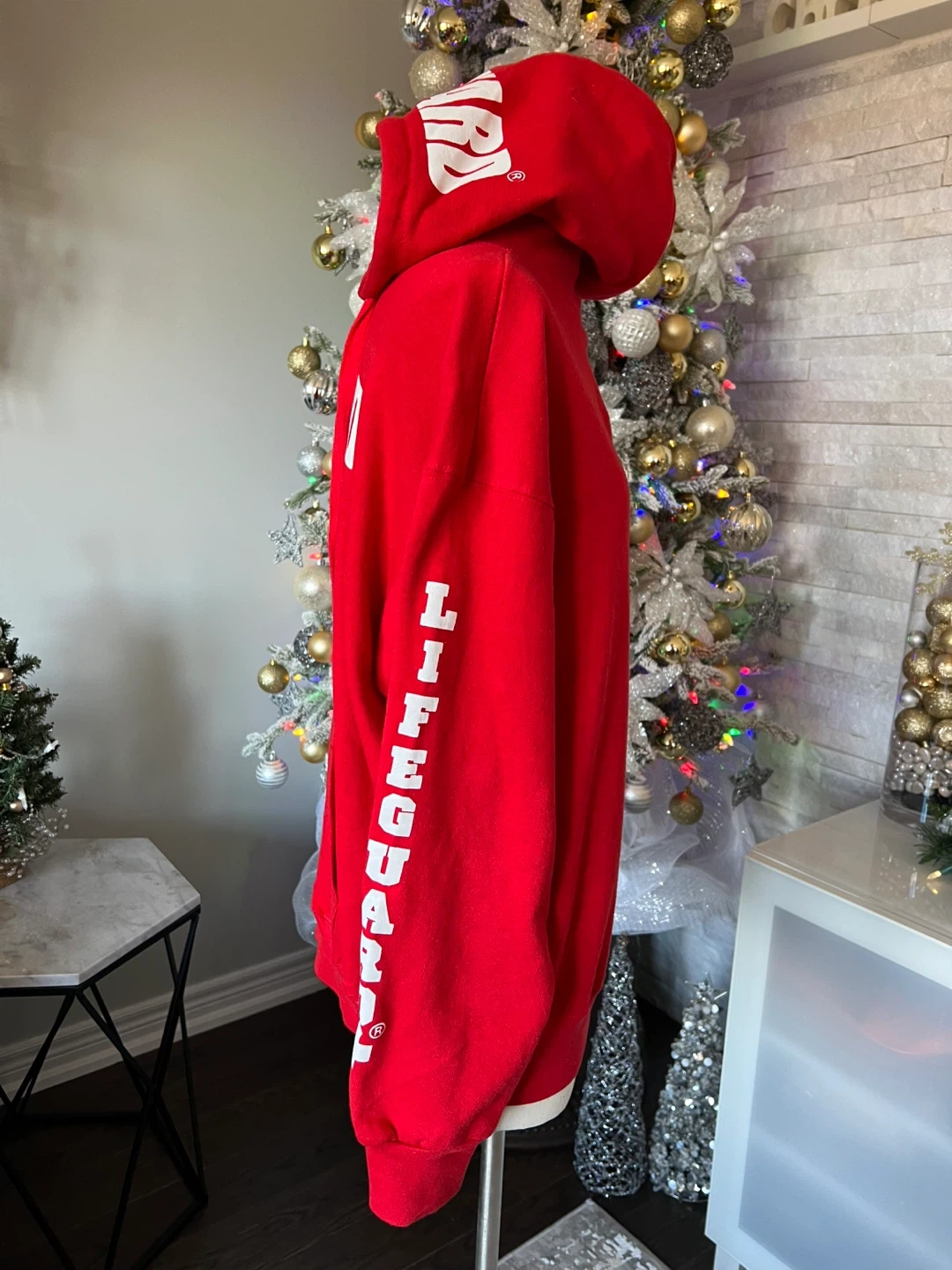 Bright red Lifeguard hoodie, perfect for staying cozy! Features the classic Lifeguard logo on the front and down the sleeve