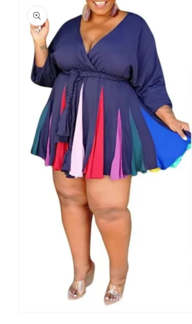Cute plus size mini dress featuring a navy blue top and a colourful pleated skirt. The skirt has rainbow coloured pleats in red, pink, blue, green, and yellow. It has a flattering V-neck and a braided tie waist.