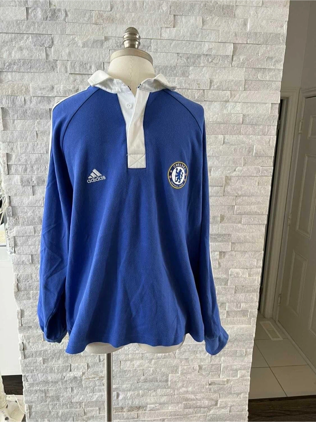 Selling an Adidas long-sleeve rugby shirt in blue featuring the Chelsea FC logo. Great for any fan!