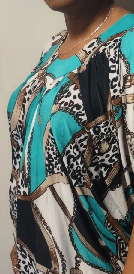 Here's a blouse with a fun and unique pattern! It features turquoise, black, and white designs, including chain and animal print elements. It's in great condition and ready to add some flair to your wardrobe