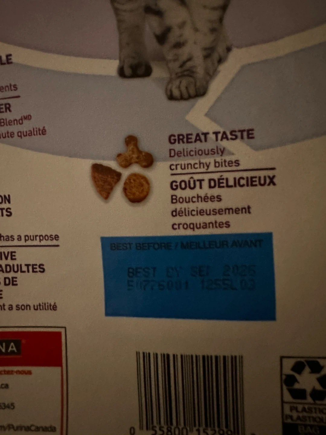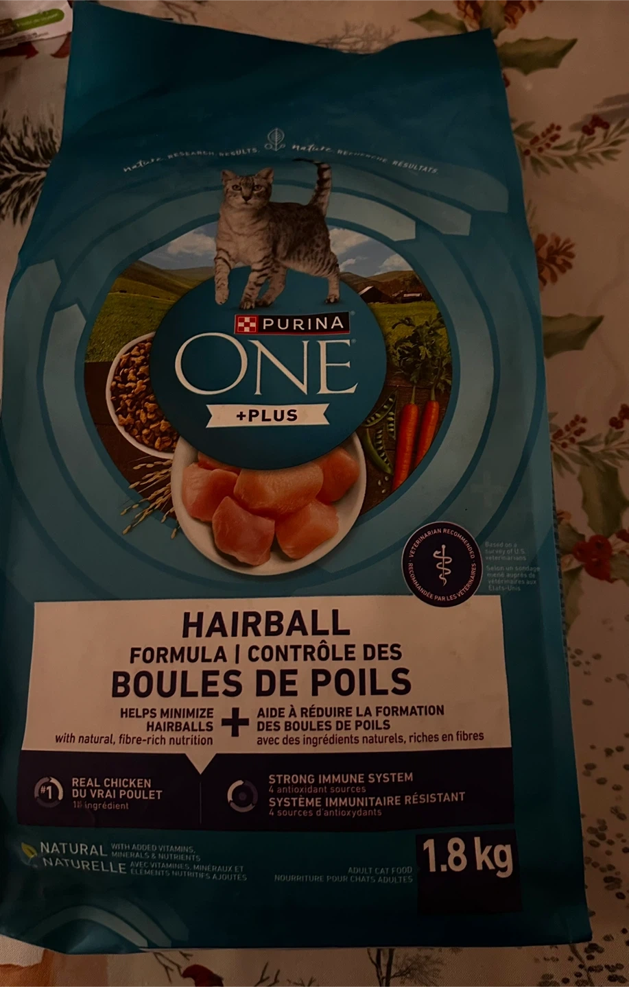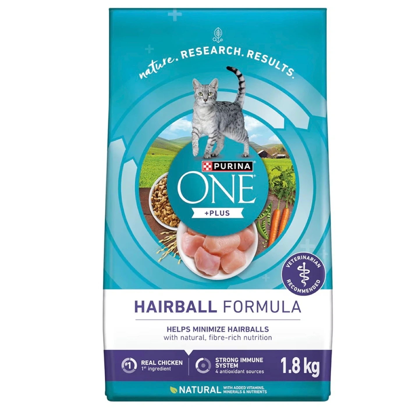 Selling a bag of Purina ONE +Plus Hairball Formula cat food. It helps minimize hairballs with natural, fibre-rich nutrition. It's a 1.8 kg bag and has a strong immune system with 4 antioxidant sources. Best before September 2026