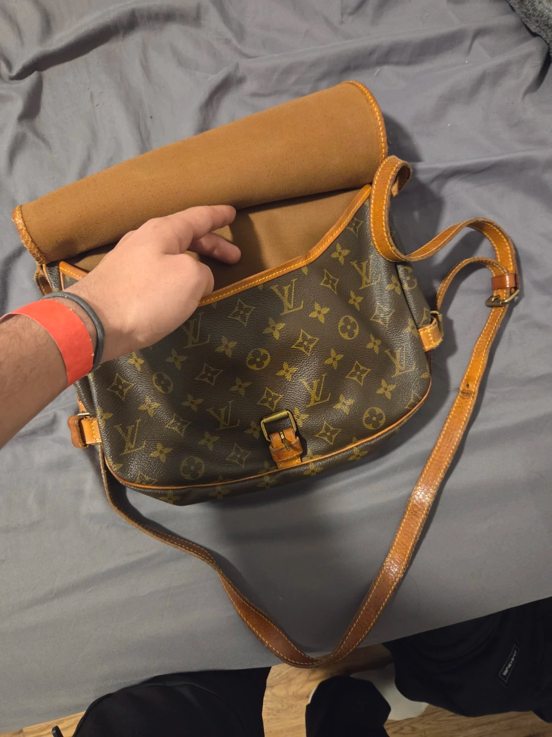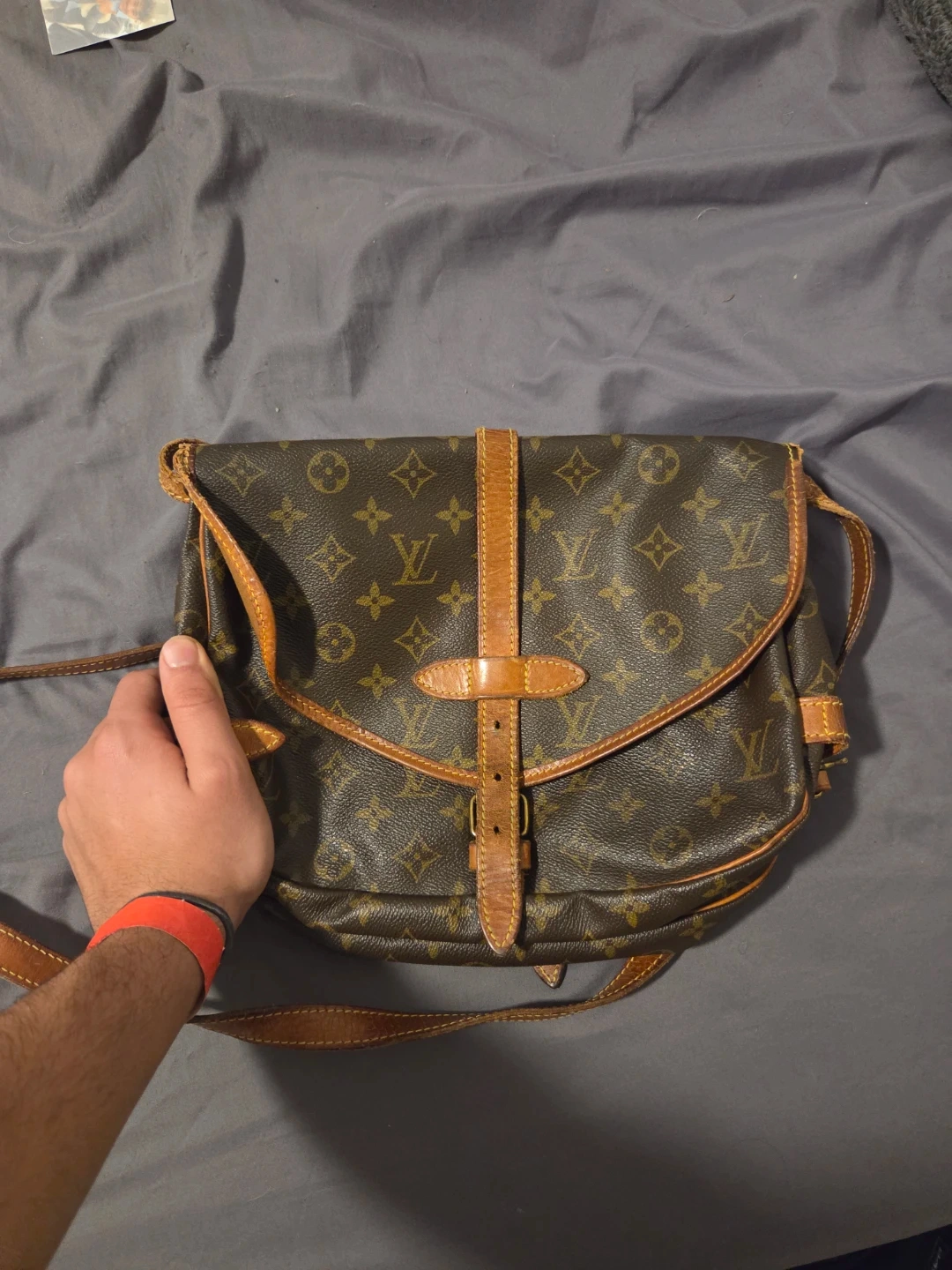 Selling a Louis Vuitton crossbody bag with the classic monogram design. It's made of leather and has a buckle closure. The bag shows some signs of wear but is still in good condition for daily use!