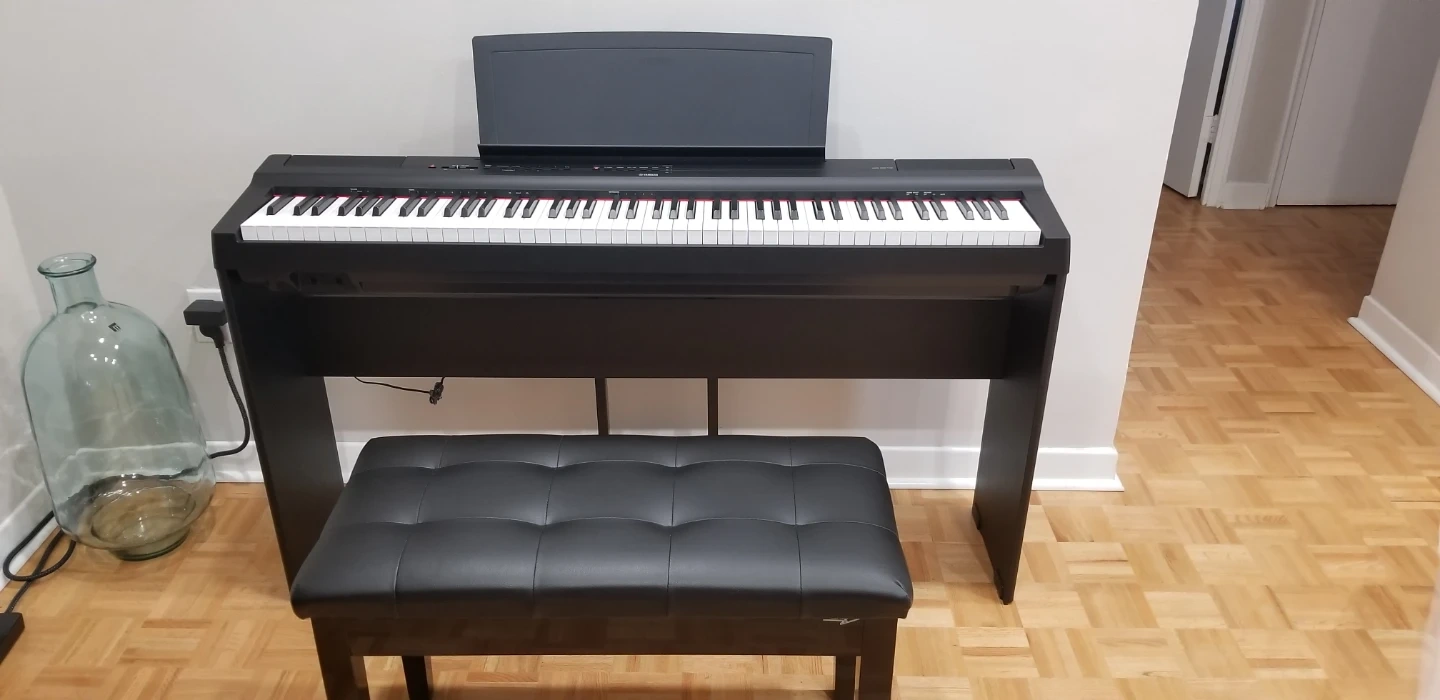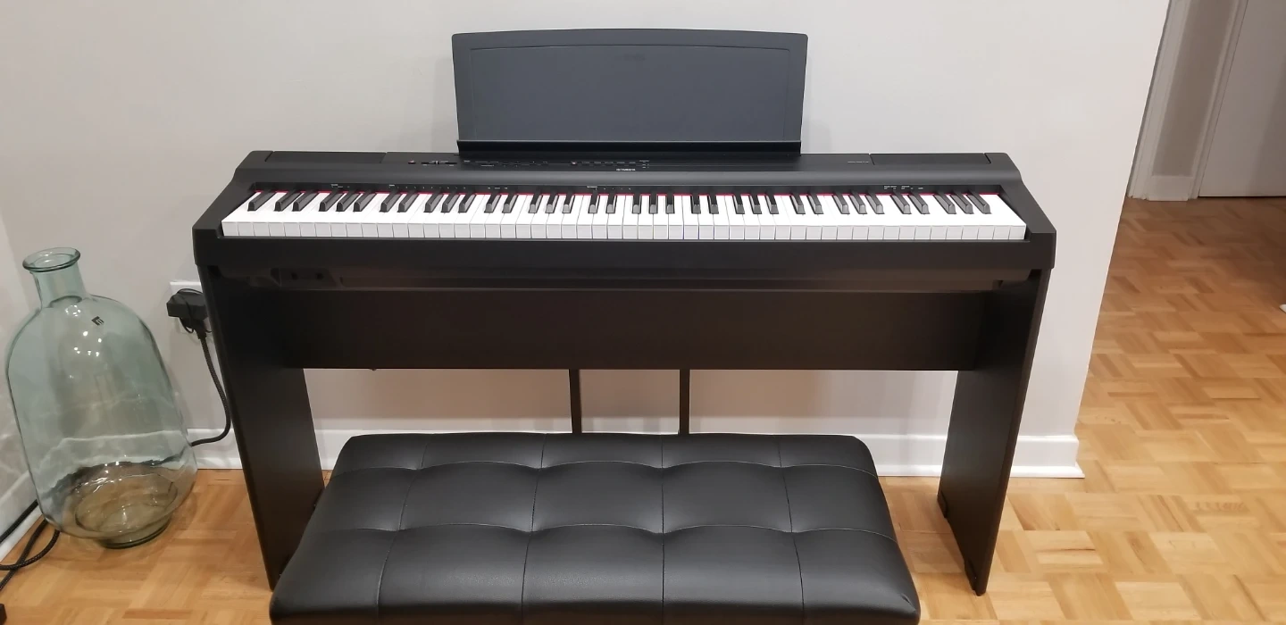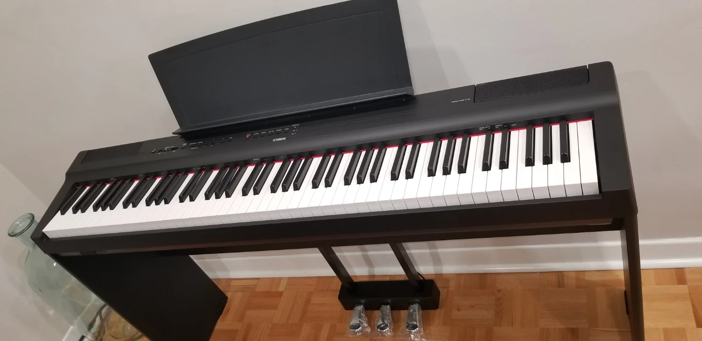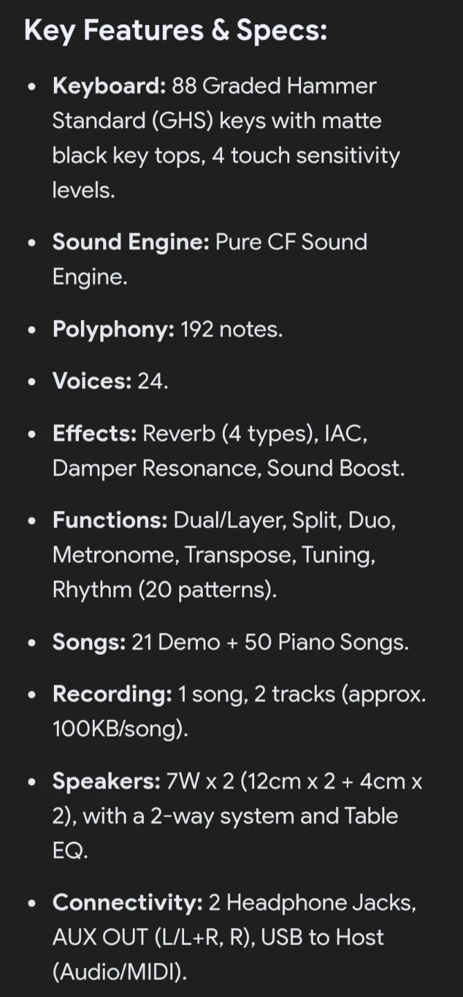 Yamaha P-125 is an 88-key digital piano featuring a Graded Hammer Standard (GHS) weighted keyboard, Pure CF Sound Engine, 192-note polyphony, and 24 voices, with effects like reverb and Intelligent Acoustic Control (IAC). It includes 20 rhythms, a 2-track recorder, dual/split/duo modes, metronome, and connectivity via AUX out and USB to Host (audio/MIDI), plus headphone jacks, but no Bluetooth. Its speakers (7W x 2) are improved with a 2-way system, and it's compatible with the Smart Pianist app for enhanced control.