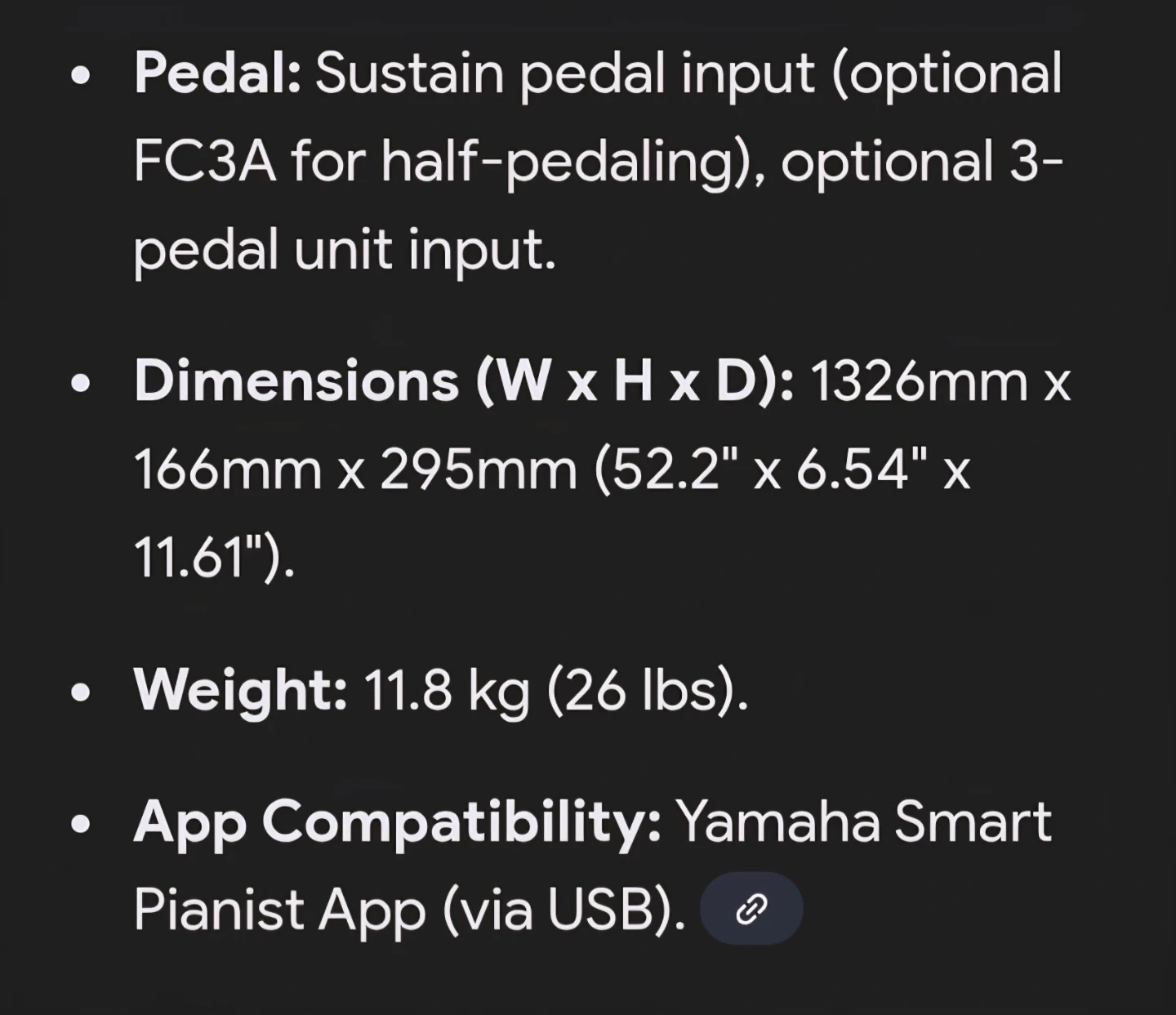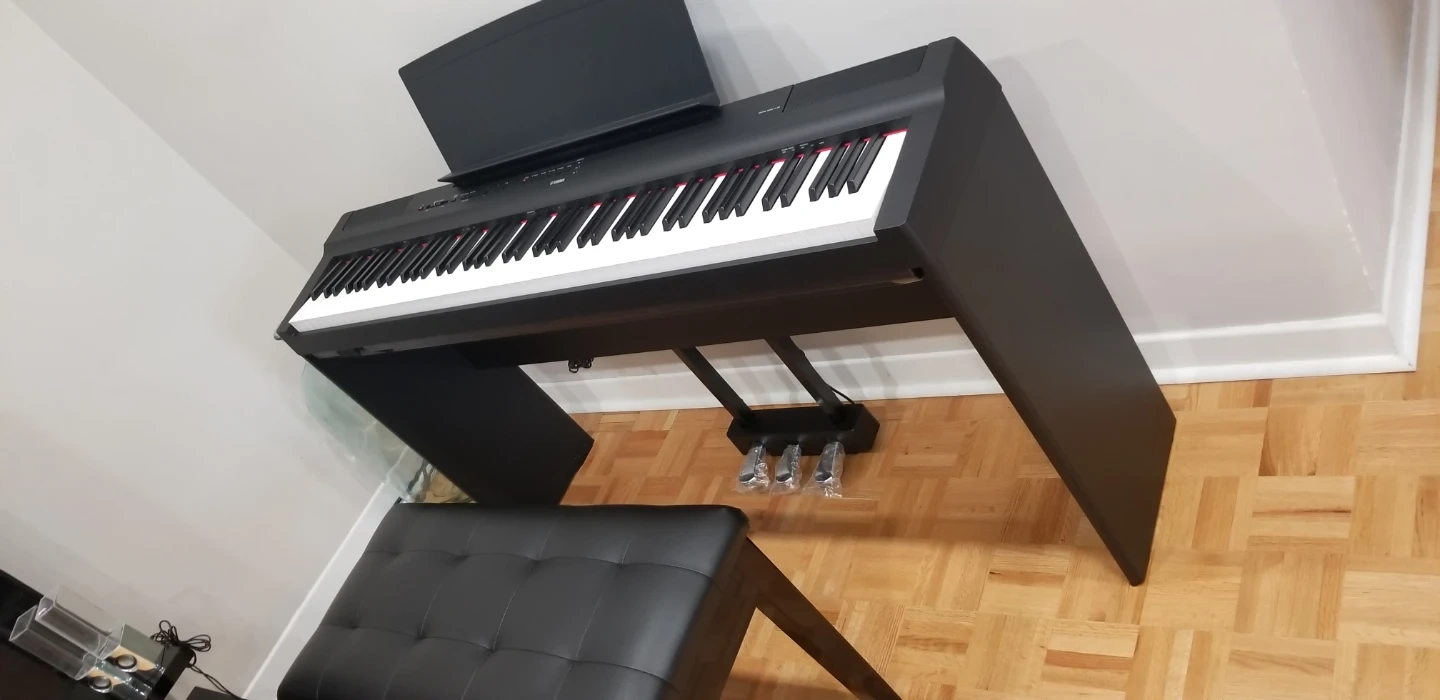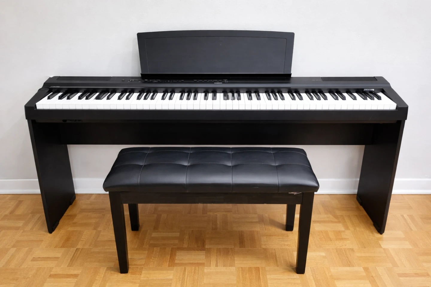 Yamaha P-125 is an 88-key digital piano featuring a Graded Hammer Standard (GHS) weighted keyboard, Pure CF Sound Engine, 192-note polyphony, and 24 voices, with effects like reverb and Intelligent Acoustic Control (IAC). It includes 20 rhythms, a 2-track recorder, dual/split/duo modes, metronome, and connectivity via AUX out and USB to Host (audio/MIDI), plus headphone jacks, but no Bluetooth. Its speakers (7W x 2) are improved with a 2-way system, and it's compatible with the Smart Pianist app for enhanced control.