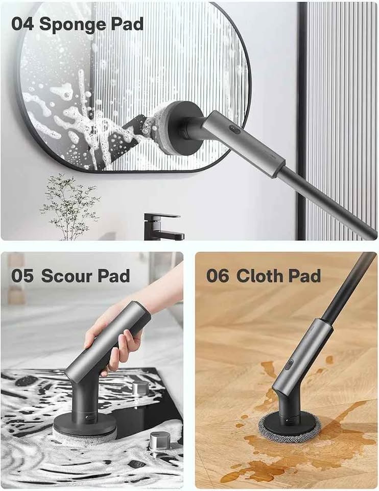 Package Included: 1 x Electric Spin Scrubber, 1 x Removable Extension Pole, 1 x Flat Brush, 1 x Small Flat Brush, 1 x Pointed Brush, 1 x Velcro Adapter, 1 x Sponge Pad, 1 x Scour Pad, 1 x Cloth Pad, 1 x Storage Bag, 1 x Charging Cable.