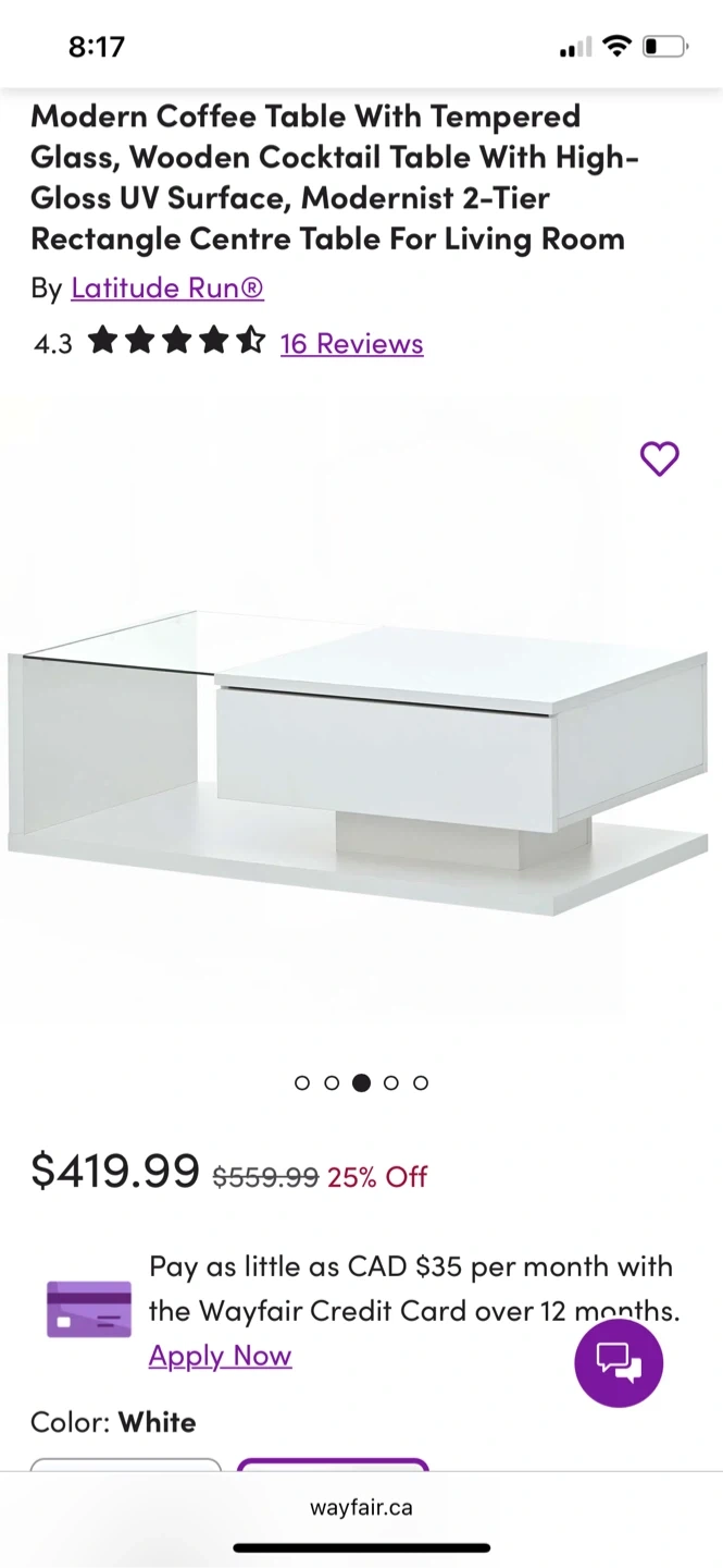 Selling a brand new Latitude Run coffee table still in its original box! It's a modern coffee table with tempered glass and a wooden cocktail table design, featuring a high-gloss UV surface and a modernist 2-tier rectangle centre table, perfect for any living room. It is white and measures 44.1" x 23.2" x 7.6". Originally bought for $419.99. Price is negotiable