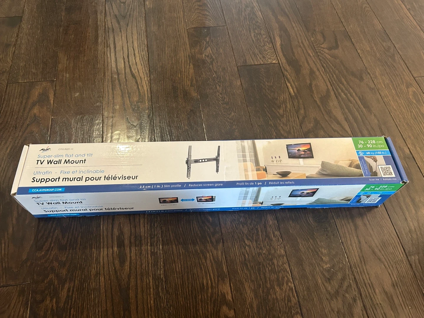 Selling a brand new AVLT super-slim flat and tilt TV wall mount! It's designed for TVs ranging from 30 to 90 inches, and supports up to 68 kg (150 lbs). The box includes everything you need for installation. It's an ultra-thin design with a 2.5 cm (1 in) slim profile, and it reduces screen glare. Perfect for creating a sleek, modern look in your living room.