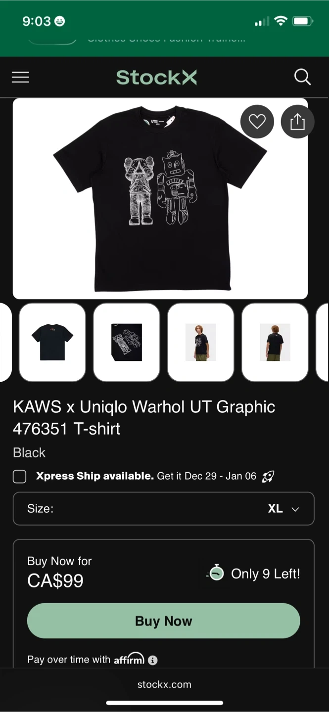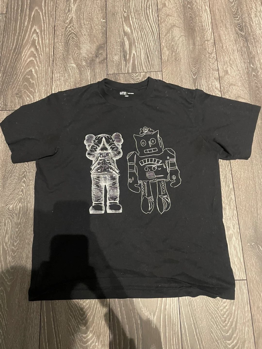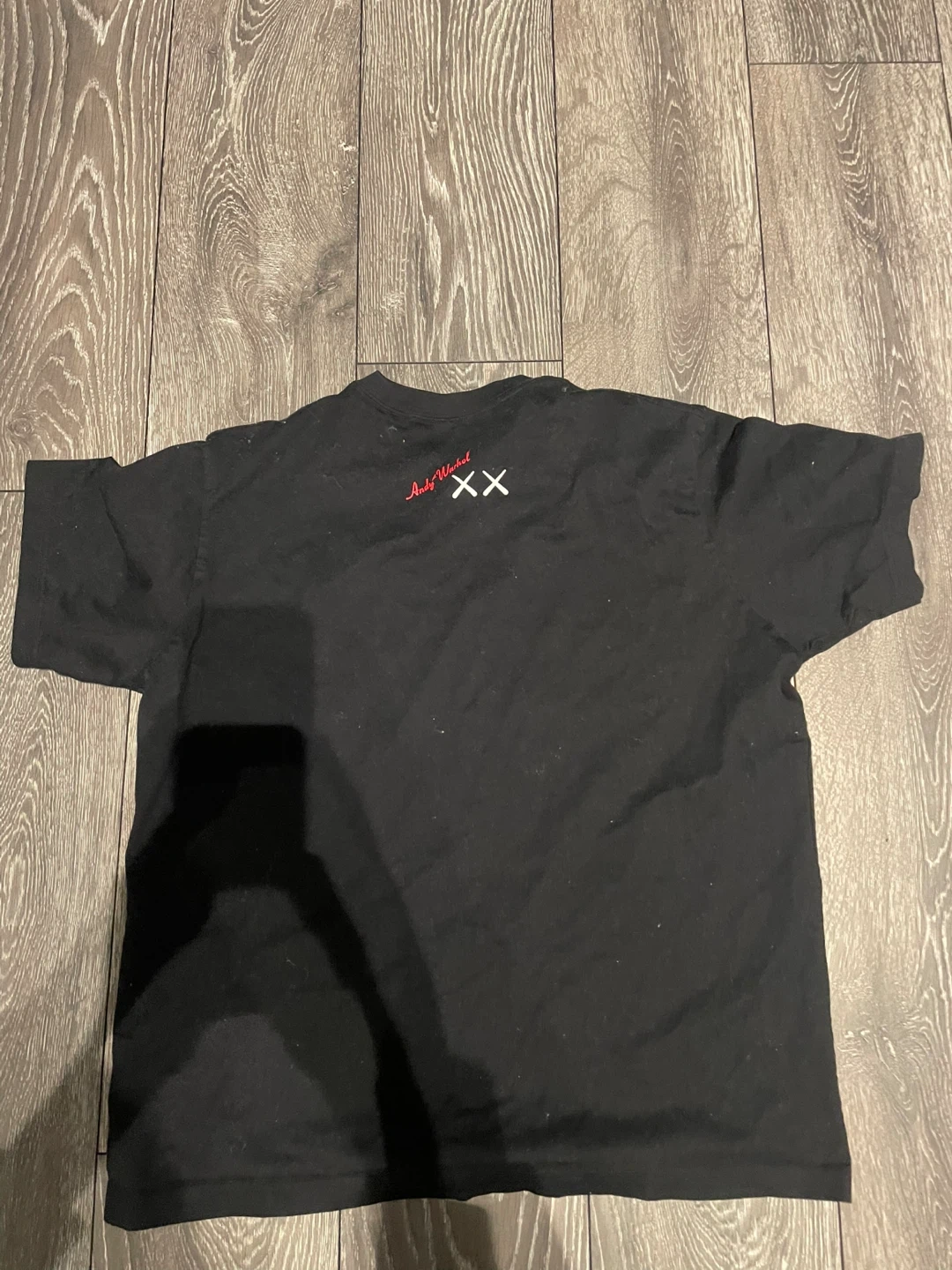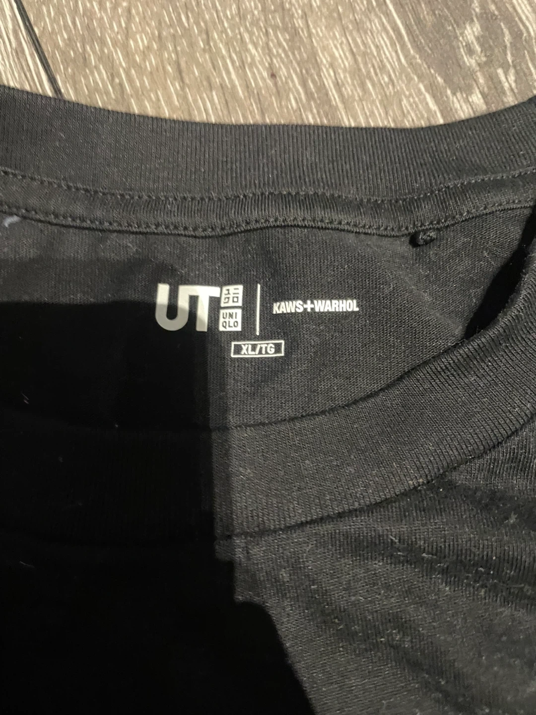 Selling a Uniqlo UT graphic T-shirt from the KAWS x Warhol collection in size XL. It's black with a unique design featuring KAWS and Warhol elements. Originally bought for CA$99.