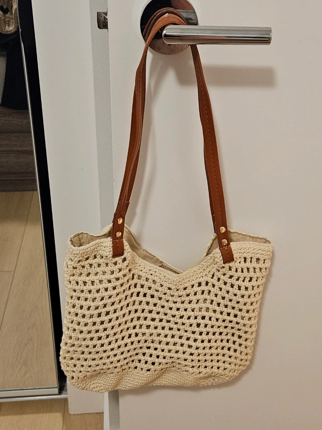 Selling a cute crochet tote bag! It has brown leather straps and a beige interior lining. Perfect for carrying your essentials. It's in great condition!