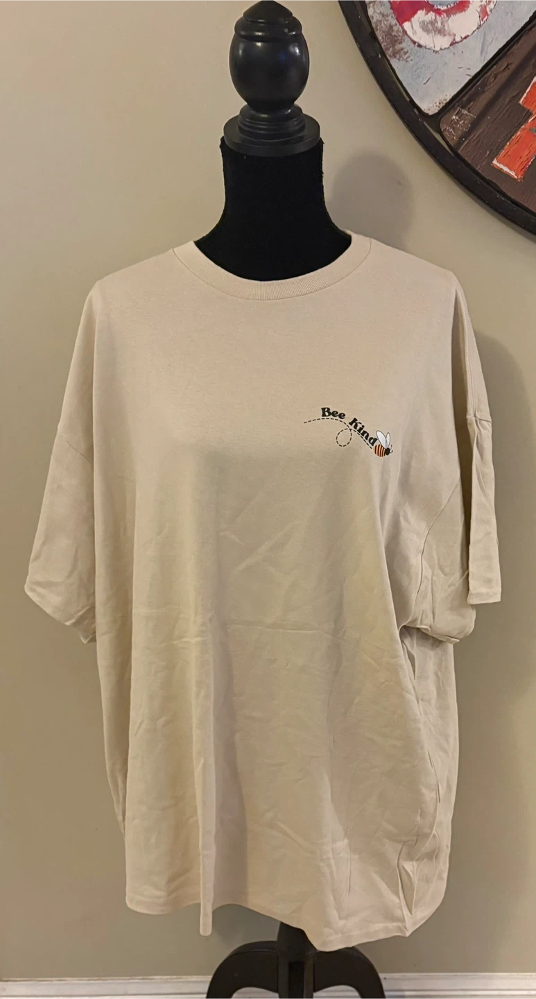 I'm selling a Gildan t-shirt in size 2XL. It's made of heavy cotton and features a cute "Bee Kind" design. It's a comfy and casual shirt! 😊
