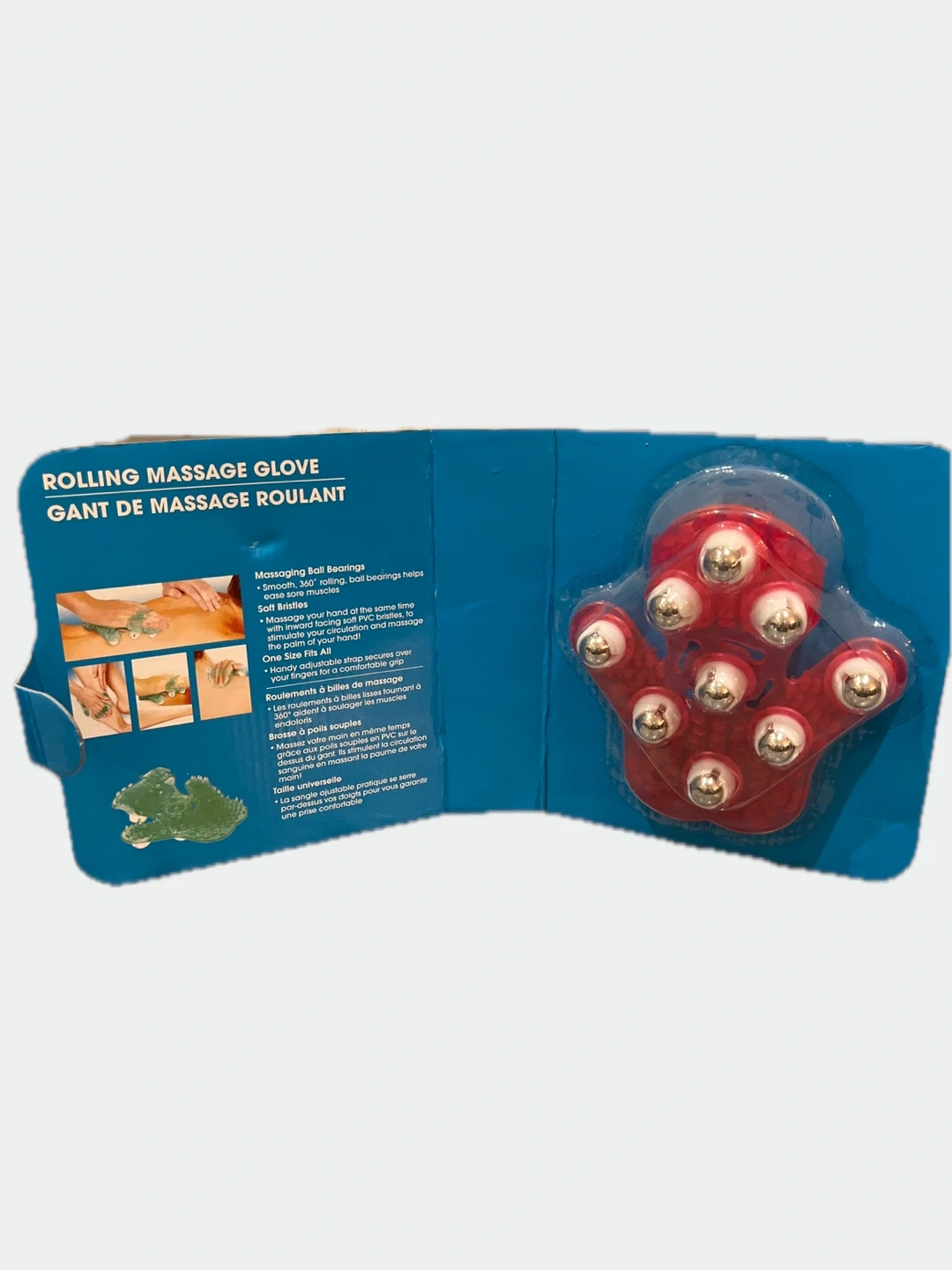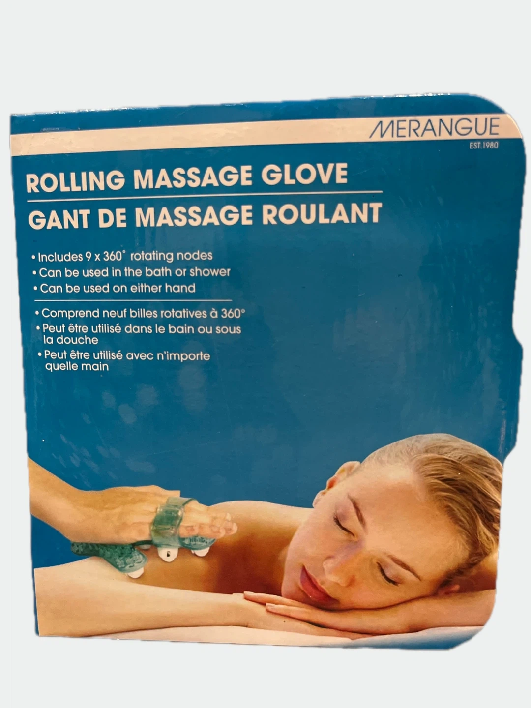 This is a Merangue rolling massage glove. It includes 9 x 360° rotating nodes and can be used in the bath or shower. It can be used on either hand