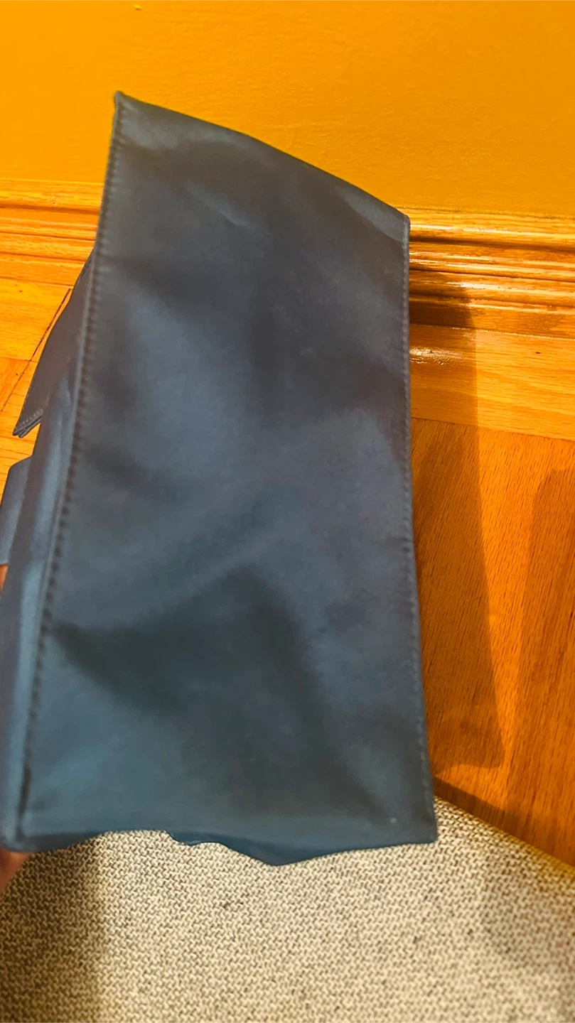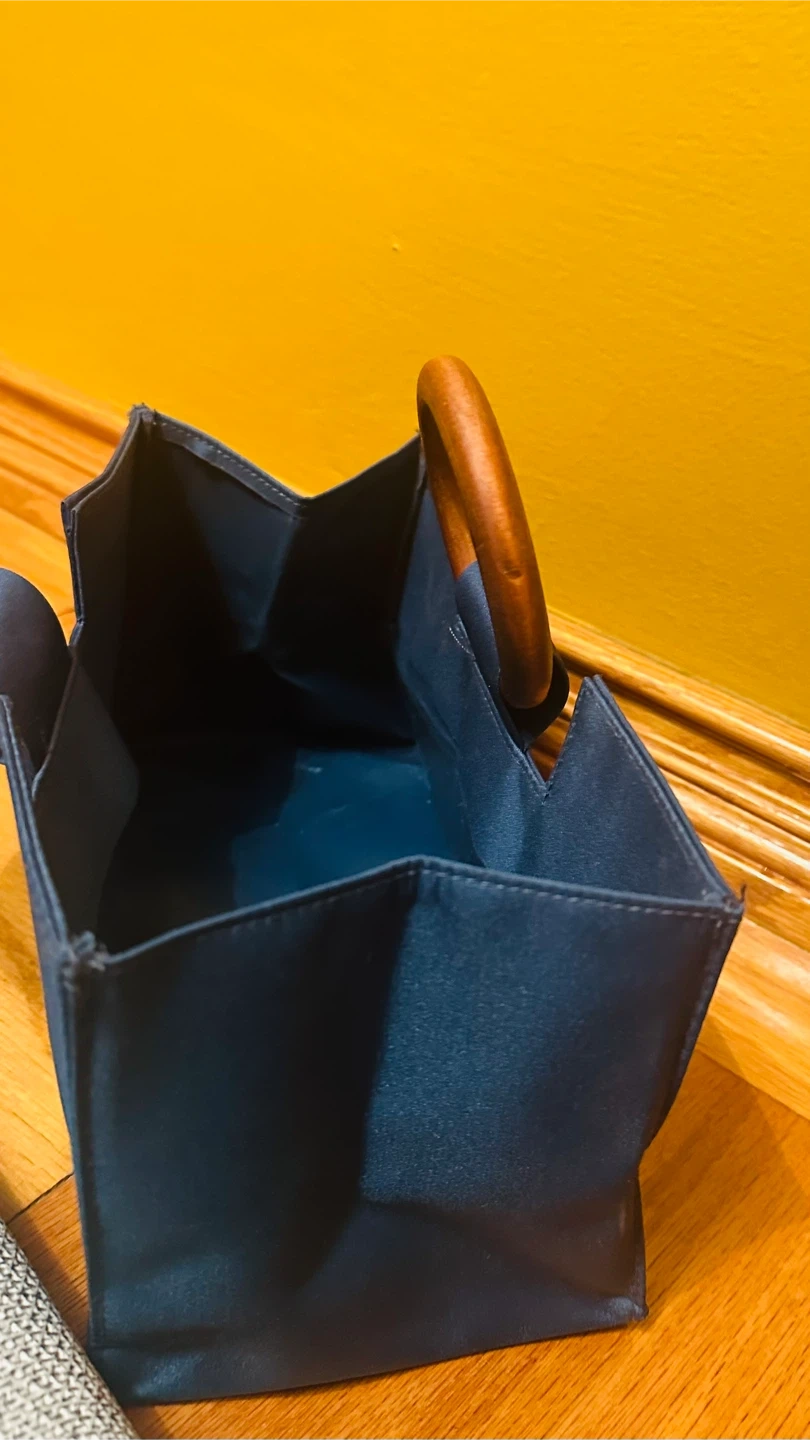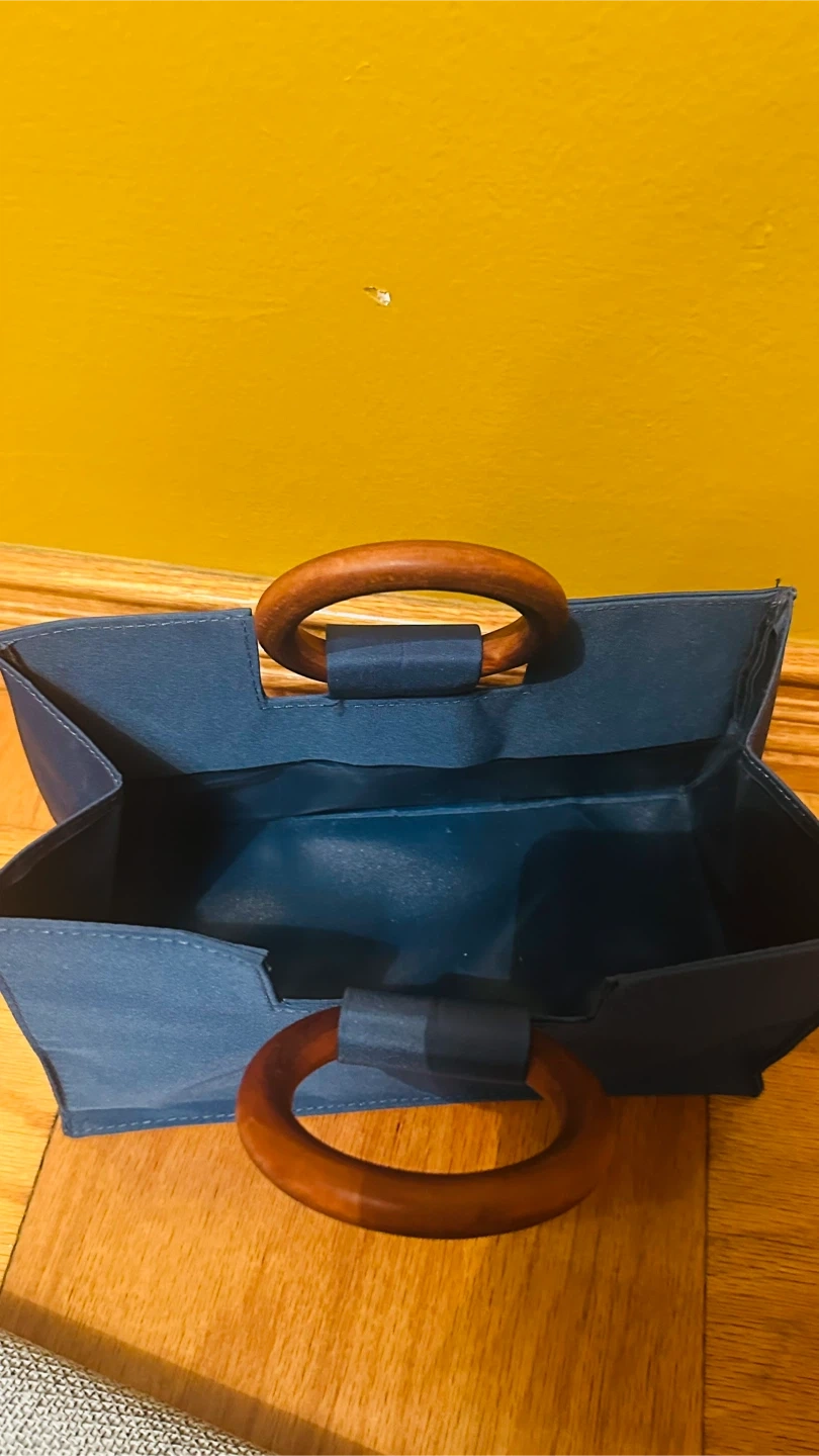 Here's a stylish blue tote bag with unique wooden handles! It's in great condition and ready to carry your essentials. The bag is a beautiful shade of blue and features sturdy wooden handles for a touch of elegance
