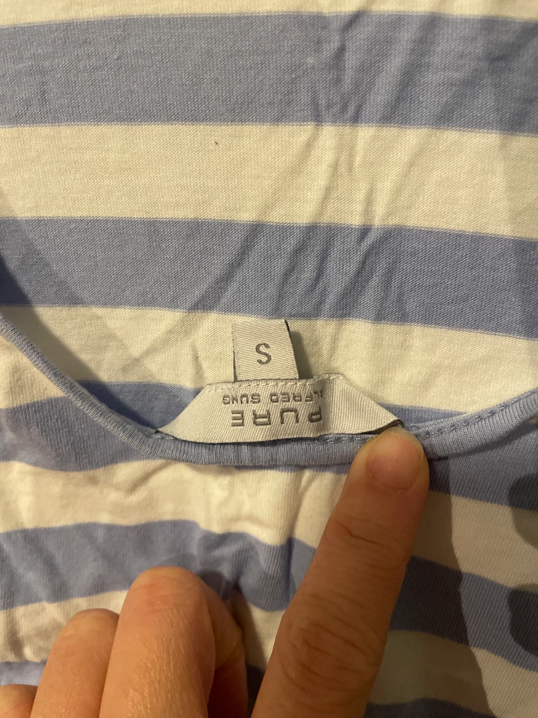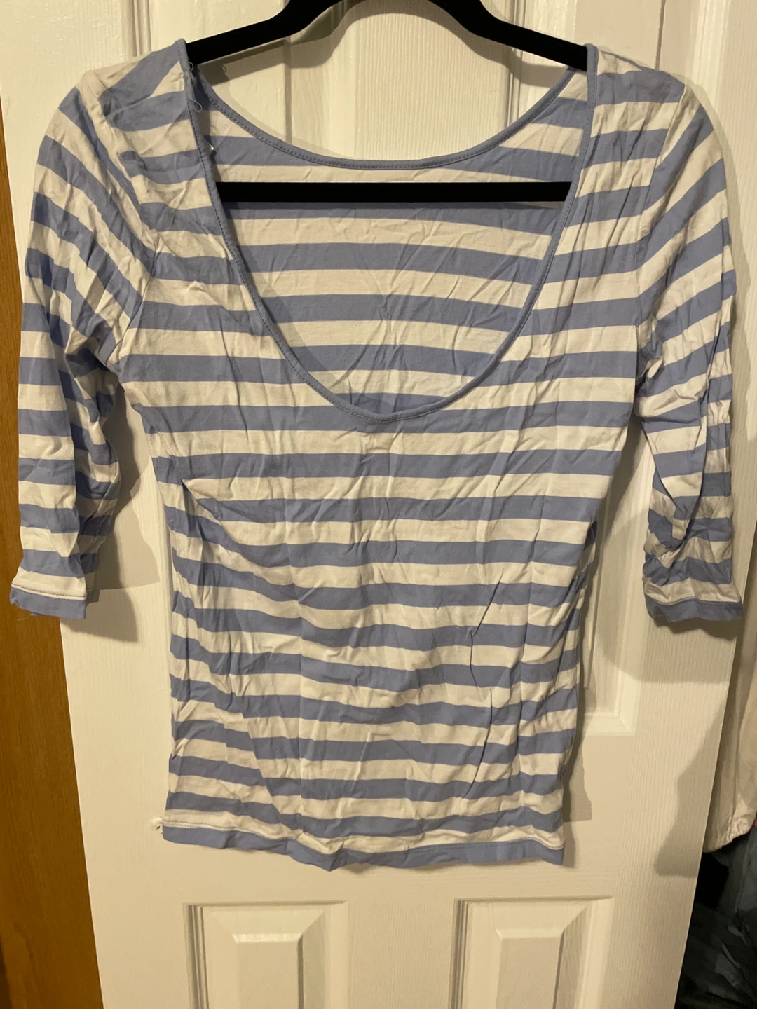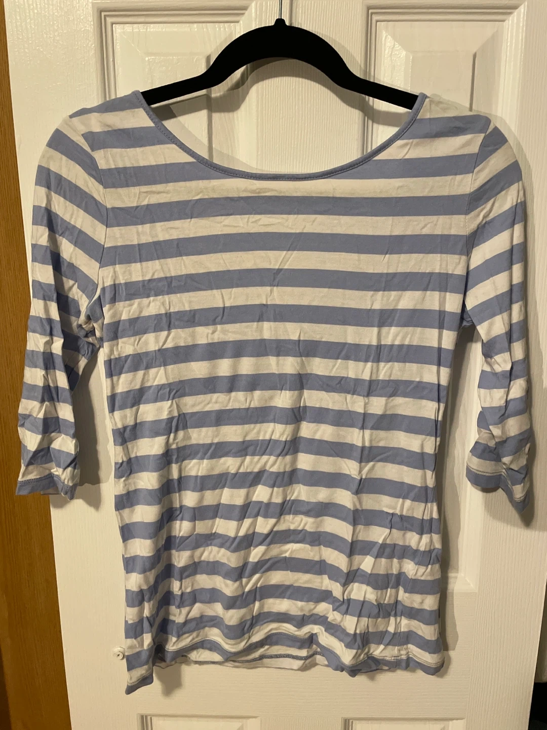 Giving away a cute Alfred Sung striped top in size small! It has a nice scoop neck and 3/4 sleeves. The stripes are a soft blue and white. It’s in great condition and ready for a new wardrobe!