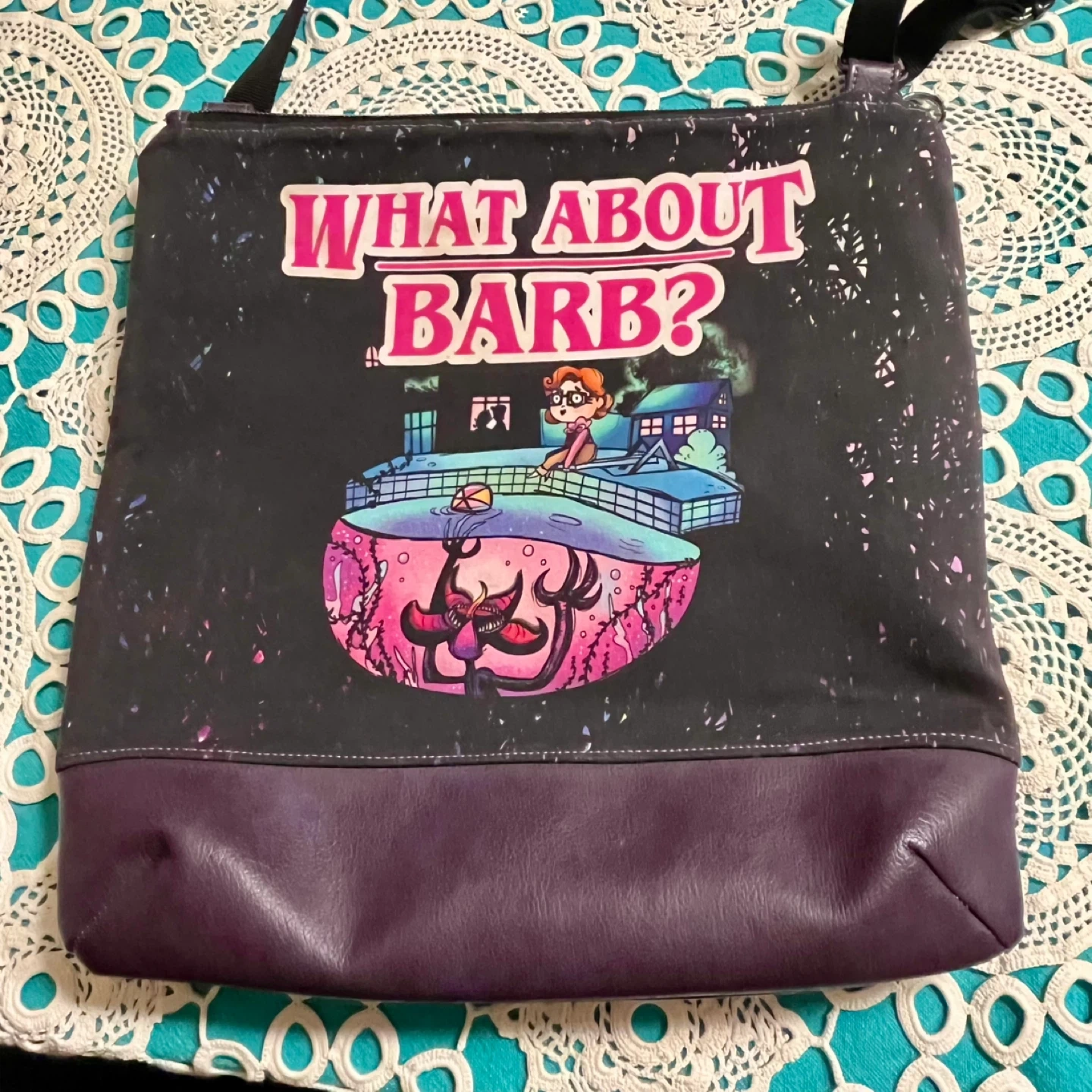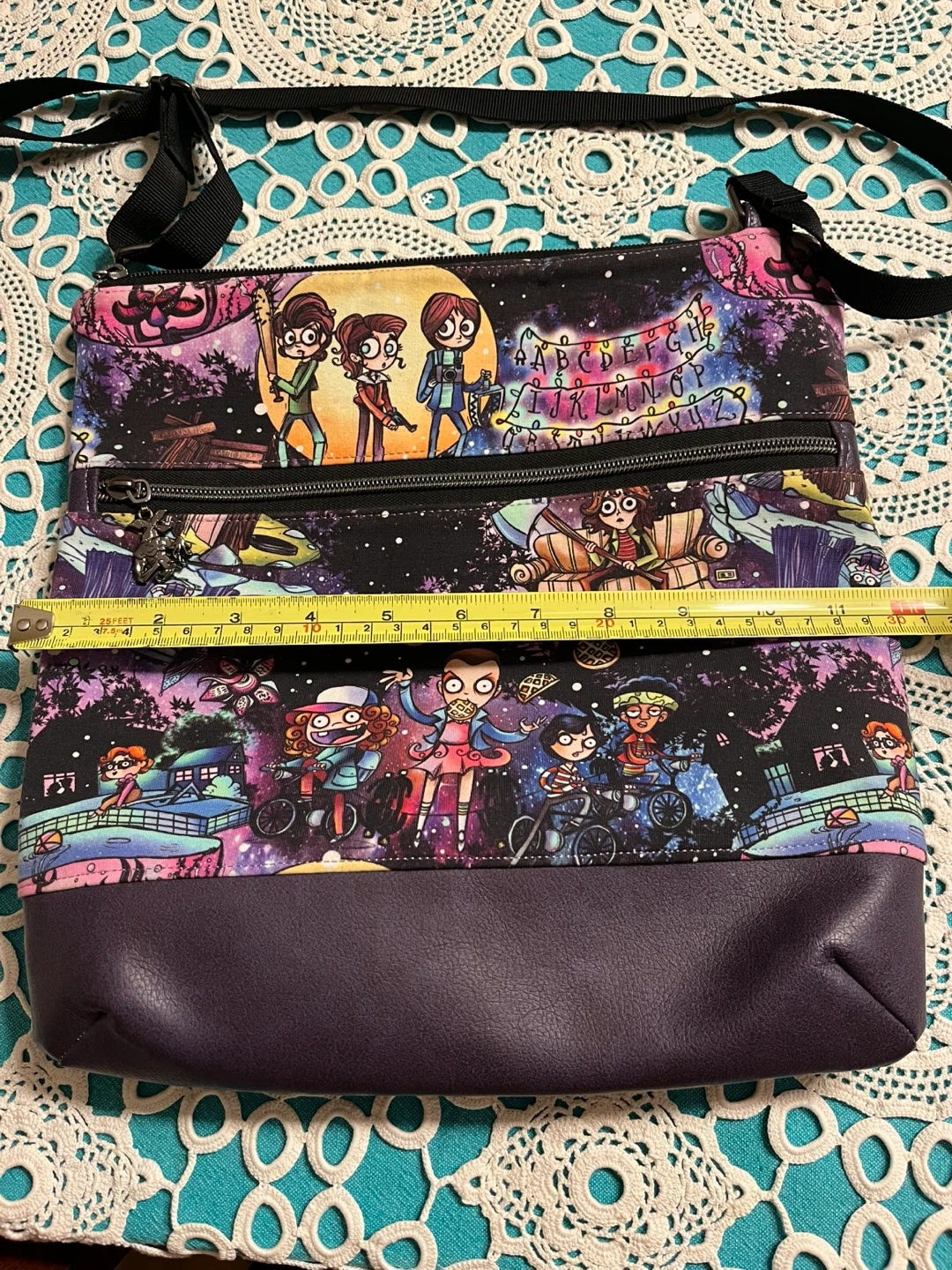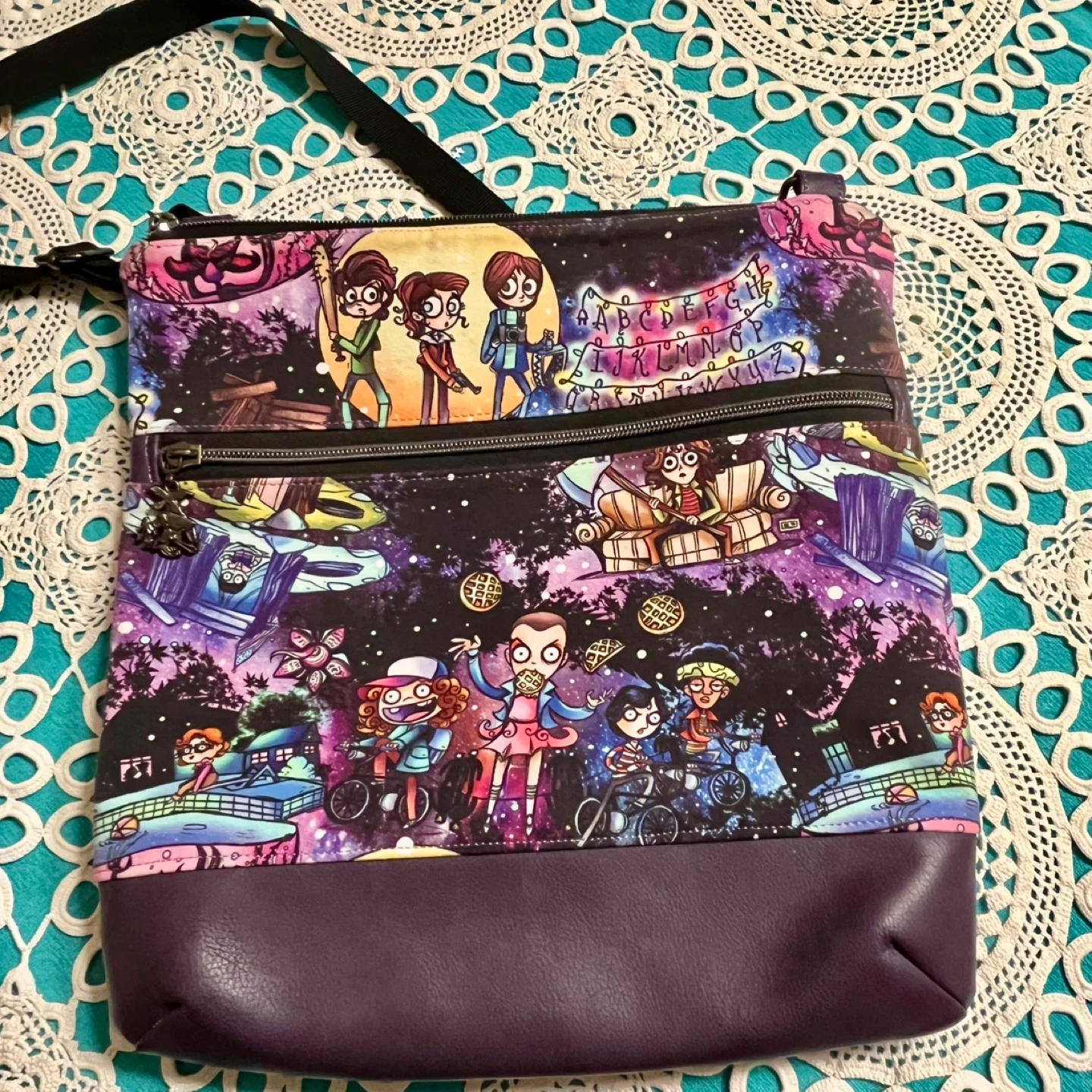 EUC handmade Stranger Things crossbody bag. Measures 12” x 12”. Lined, excellent zippers - one with a demagogon charm/pull and beautifully stitched. Very sturdy and durable. A one-of-a-kind piece.