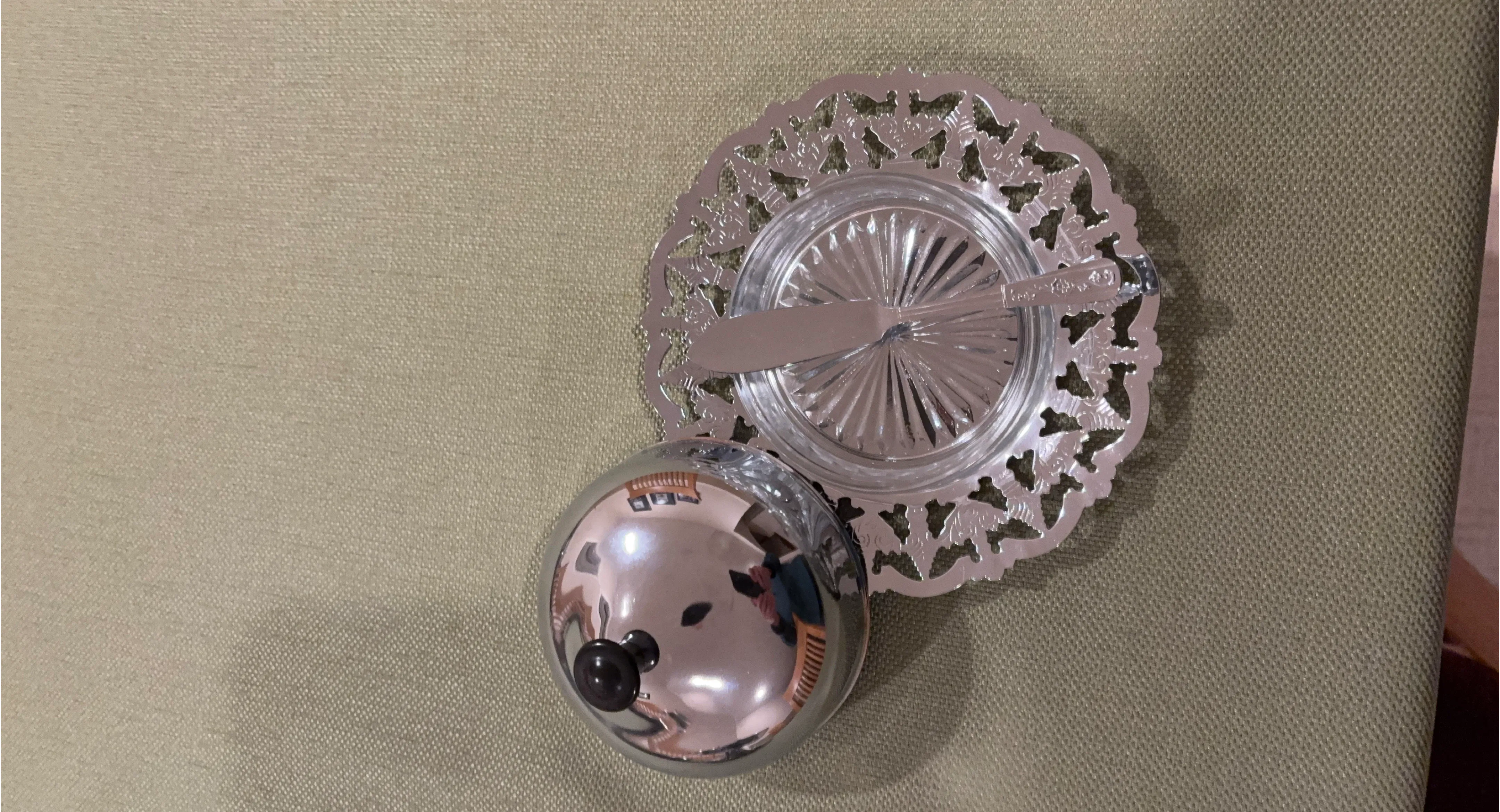 Selling a lovely vintage silver butter dish with a knife. It's in great condition and would make a charming addition to any table setting! The silver detailing is quite intricate.