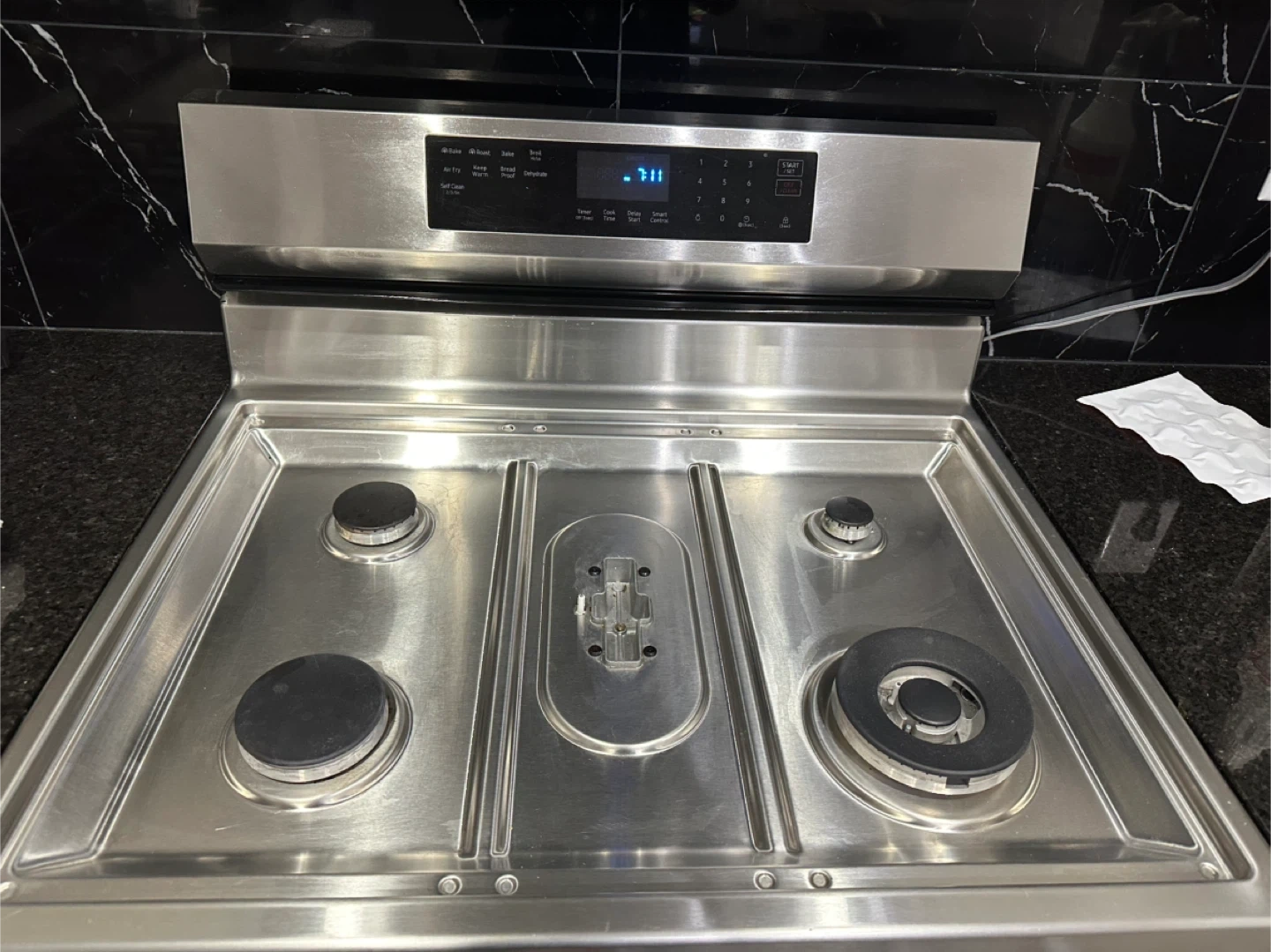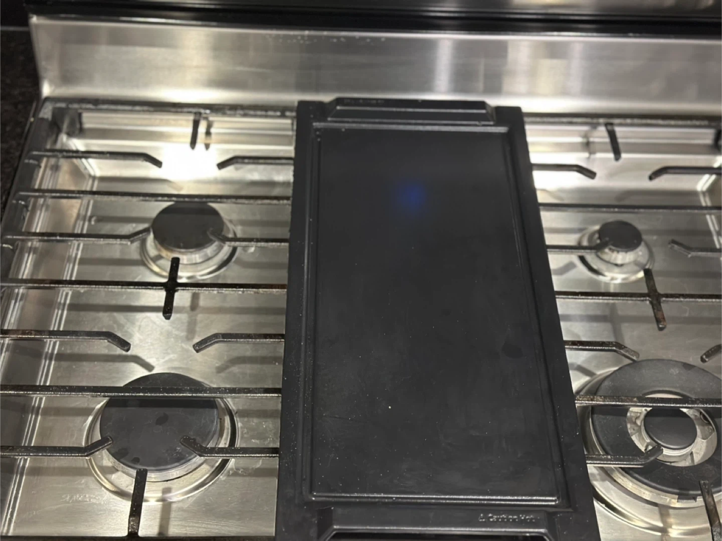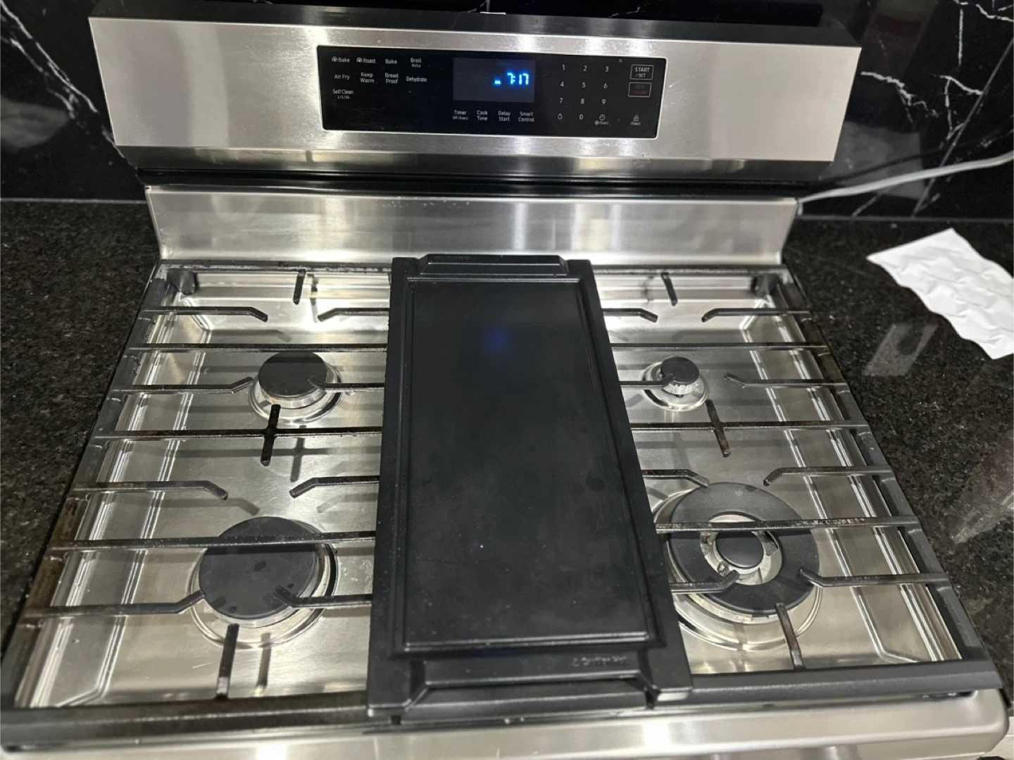 Upgrade your kitchen with this Samsung gas range! This used appliance features four burners and a built-in griddle, perfect for all your cooking needs. It's in brand new condition and i have used it only for 2 months and it still looks brand new you can see the pictures. It has five year warranty with it and all the receipts.