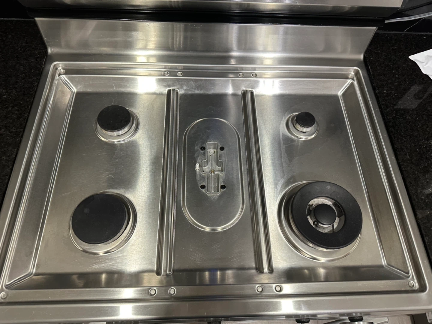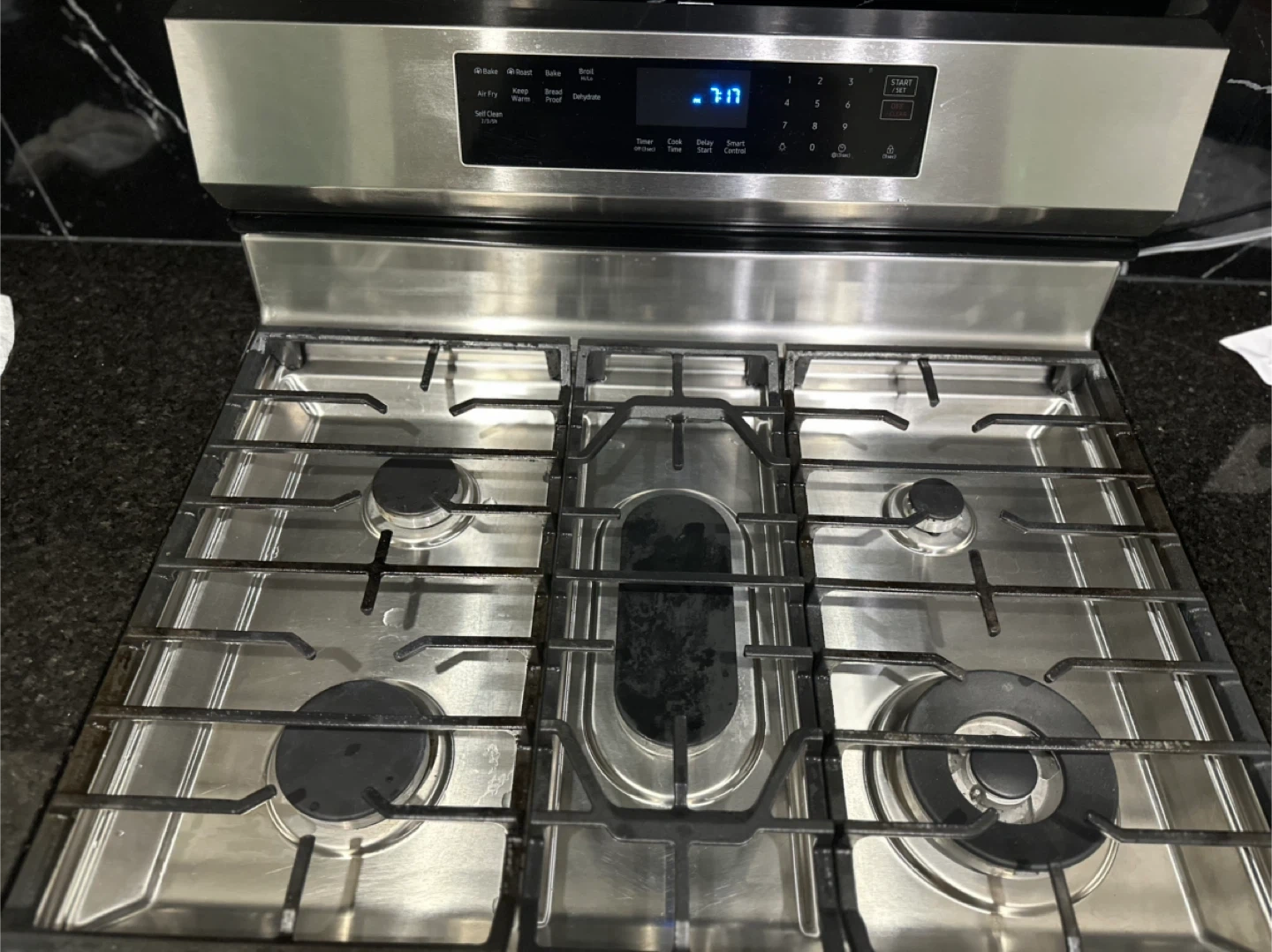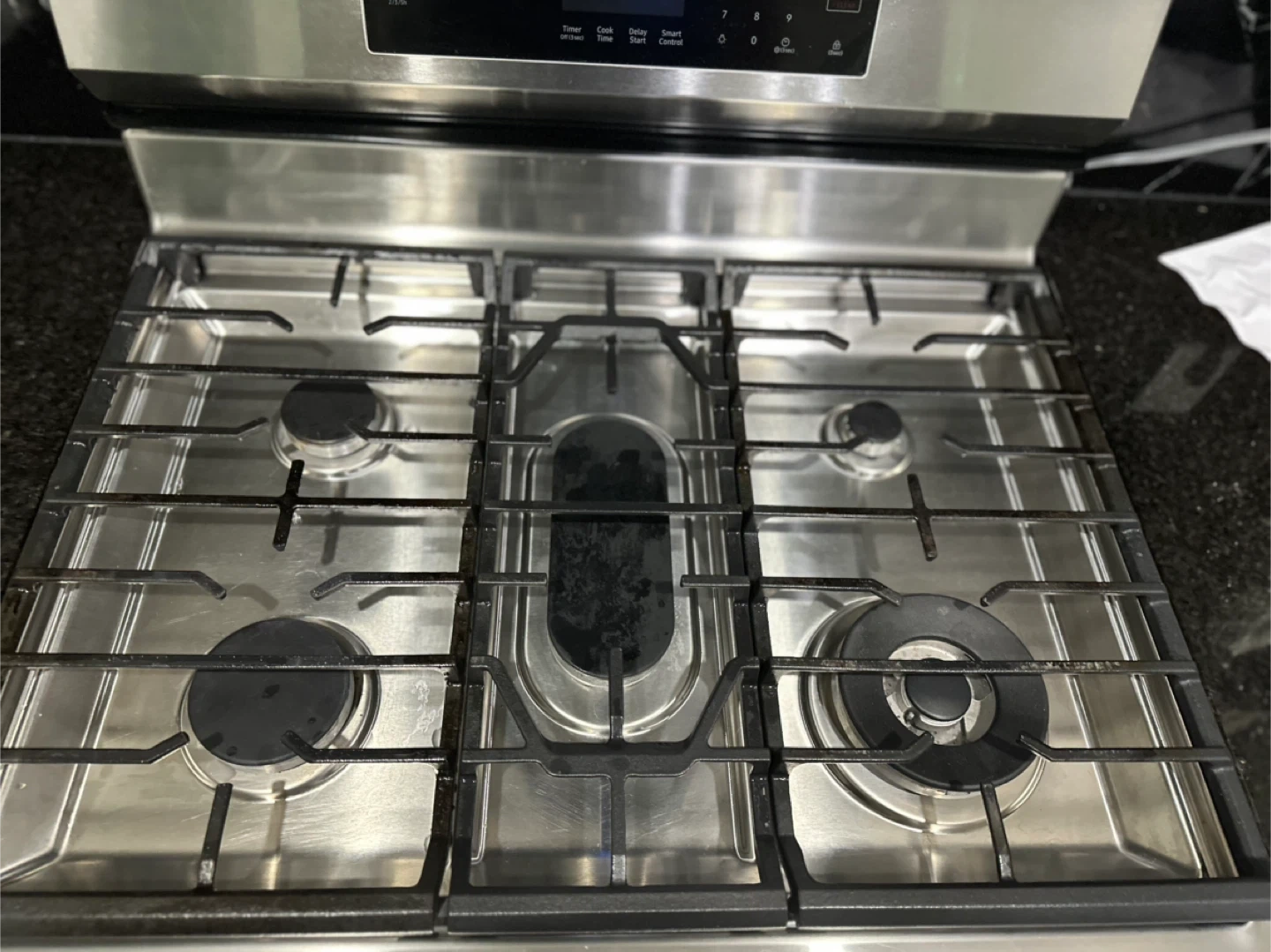 Upgrade your kitchen with this Samsung gas range! This used appliance features four burners and a built-in griddle, perfect for all your cooking needs. It's in brand new condition and i have used it only for 2 months and it still looks brand new you can see the pictures. It has five year warranty with it and all the receipts.