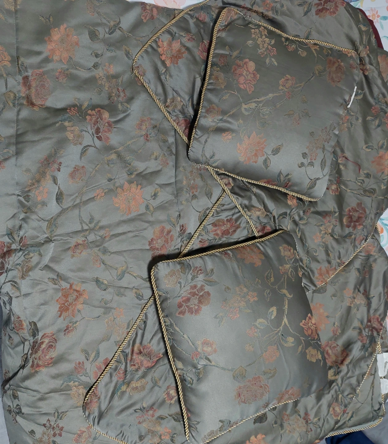 King size Cozy silk bedding set with a floral pattern, includes a comforter and matching pillows. Perfect for adding a touch of elegance to your bedroom!