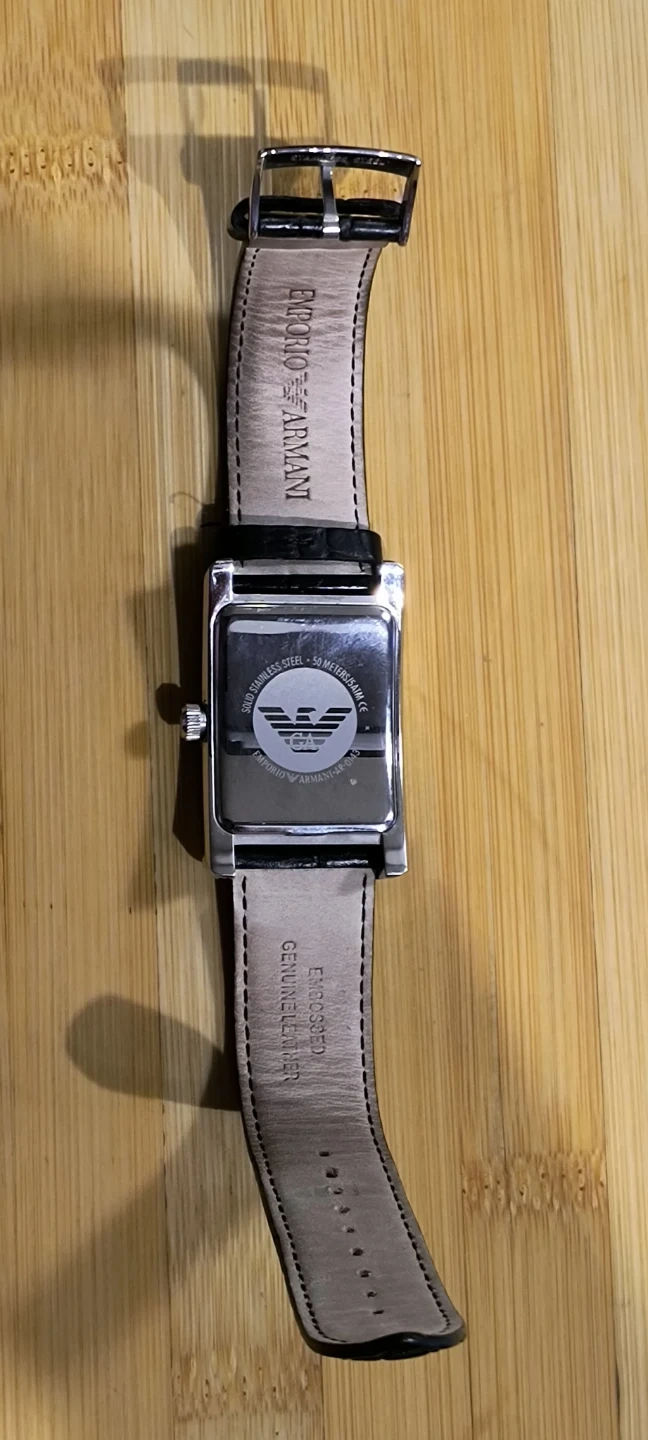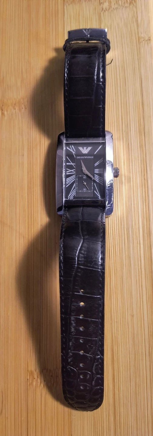 Selling a stylish Emporio Armani men's watch. It features a sleek black dial with a stainless steel case and a genuine leather band. A great addition to any outfit! It needs a Battery Replacement.