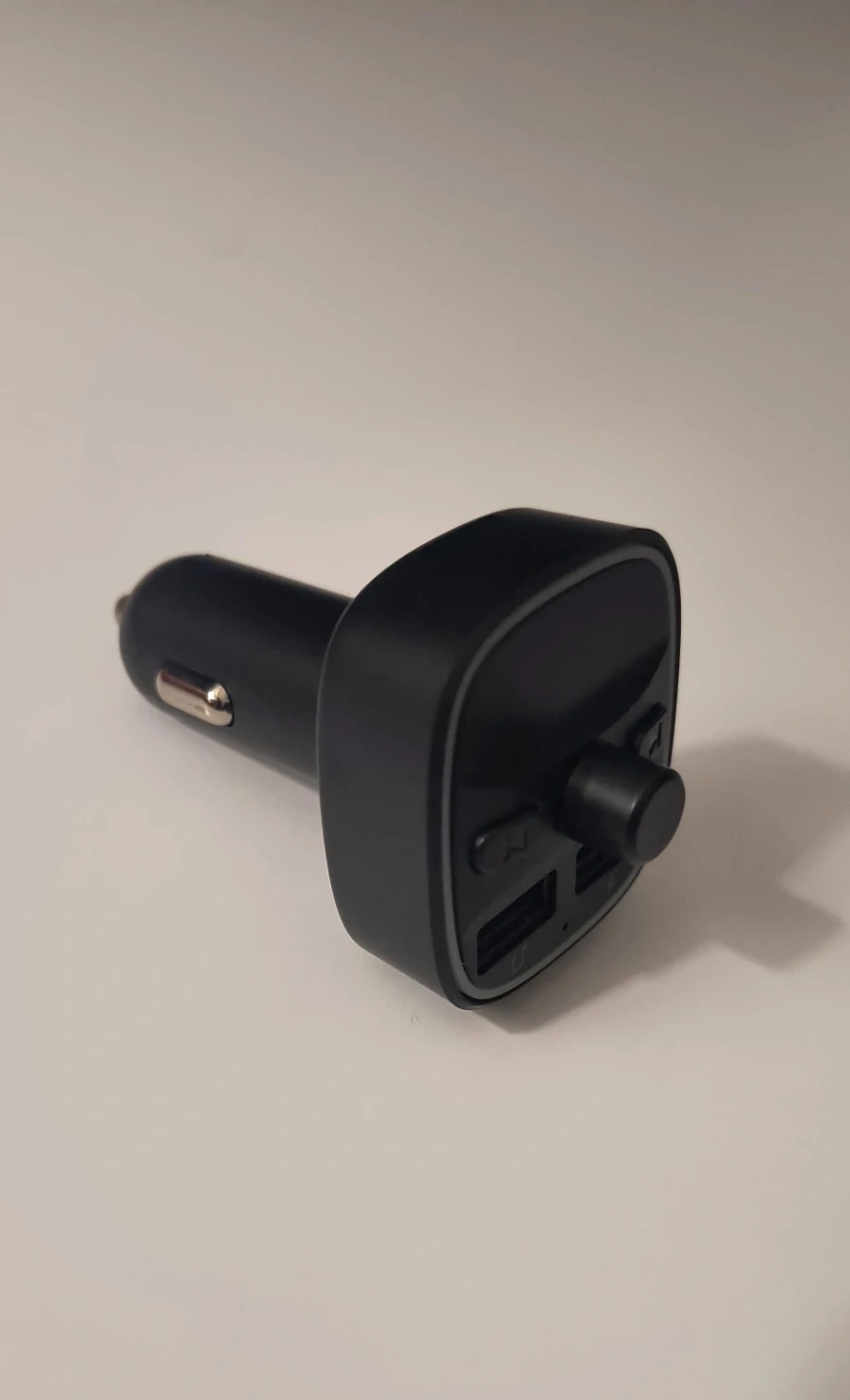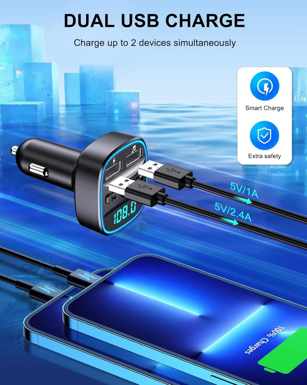 This Car Bluetooth FM Transmitter (T25) has dual USB ports for charging two devices at once! It features one-button control, a microphone, and an LED display. It also has an ambient light and a TF card slot. Charge up to 2 devices simultaneously with 5V/1A and 5V/2.4A outputs