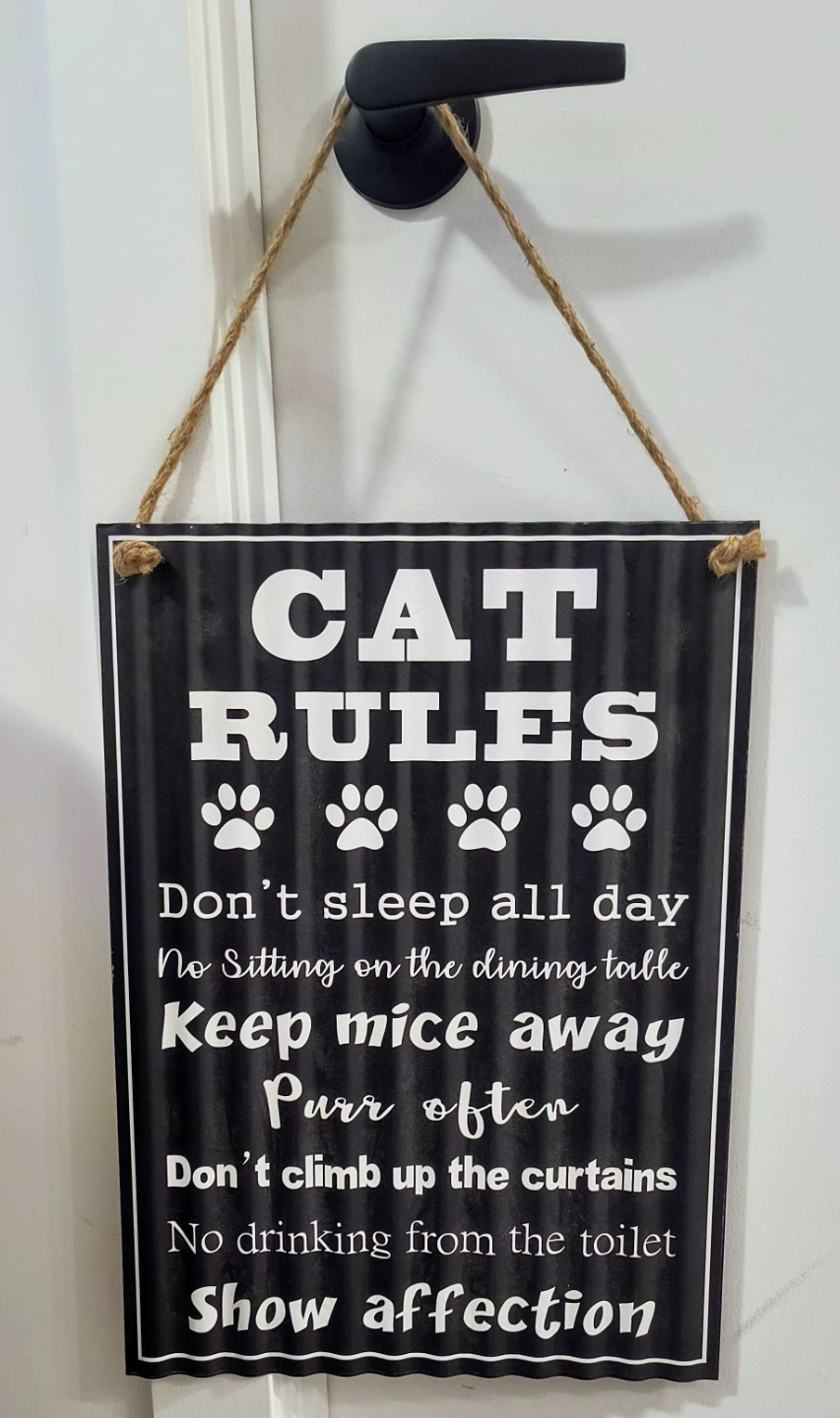 Here's a cute metal hanging sign with cat rules! It's a fun piece of decor for any cat lover's home.