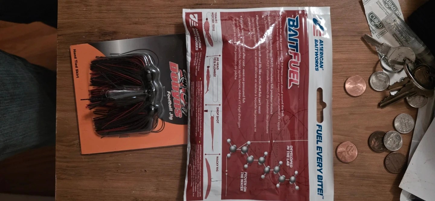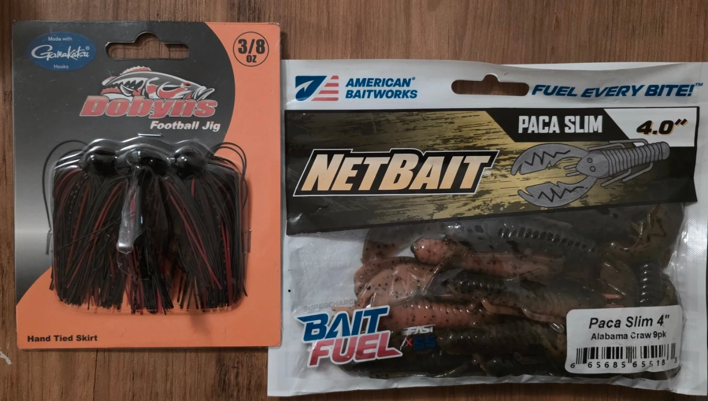 Selling a Dobyns Football Jig 3/8 oz in Midnight Red and a pack of NetBait Paca Slim 4" Alabama Craw. Perfect for your next fishing trip! The package has a little damage selling it for a low price
