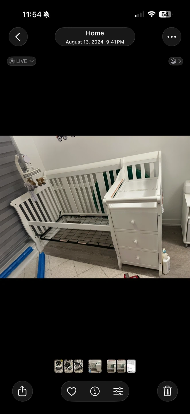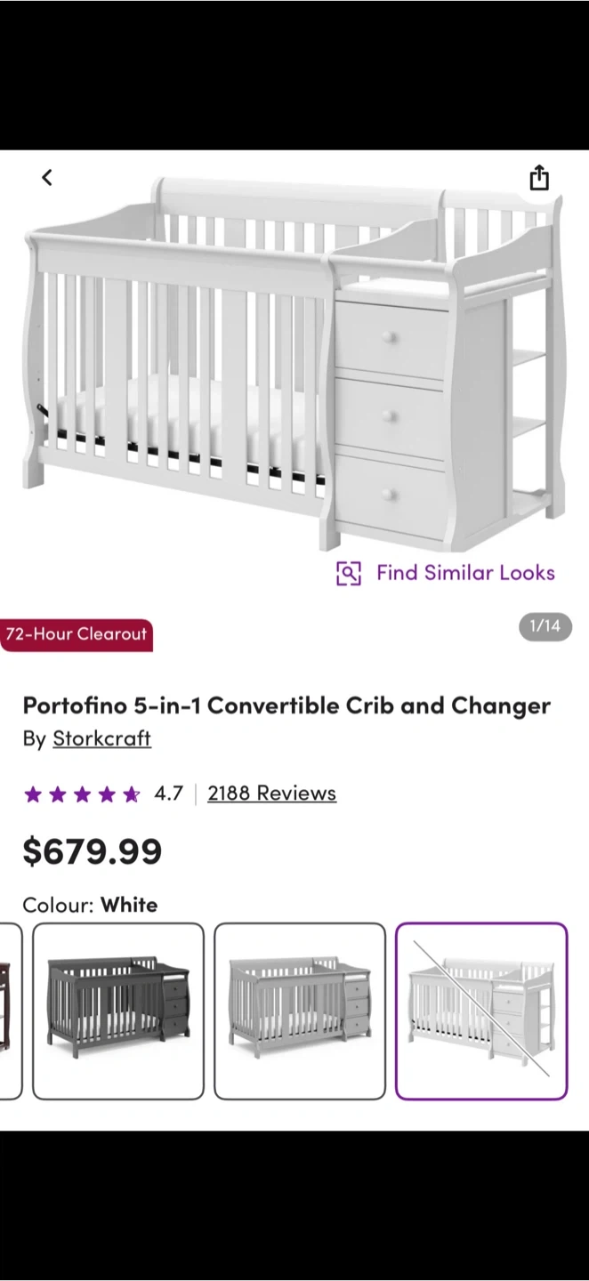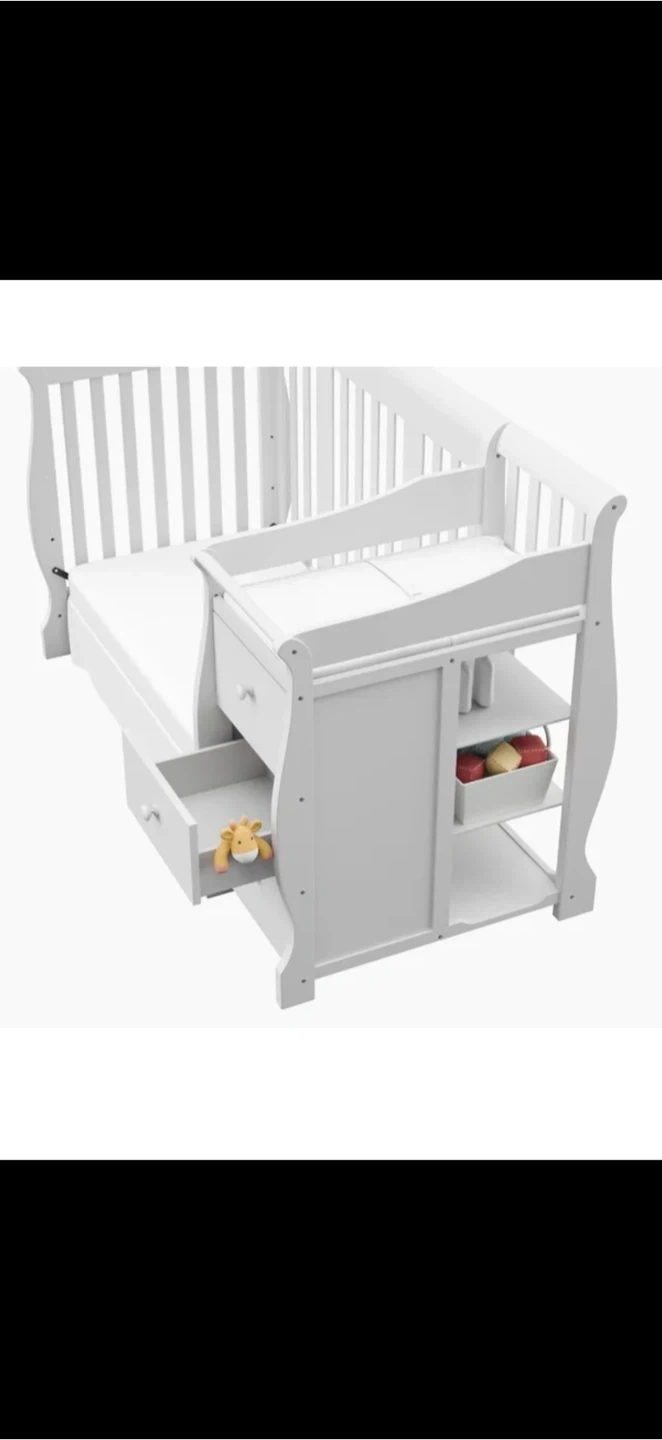 Selling a Storkcraft Portofino 5-in-1 Convertible Crib and Changer in white! This versatile crib converts to different bed sizes as your child grows. It also includes a convenient changing table with drawers and shelves for storage. Dimensions are 71" x 32.5" x 41"