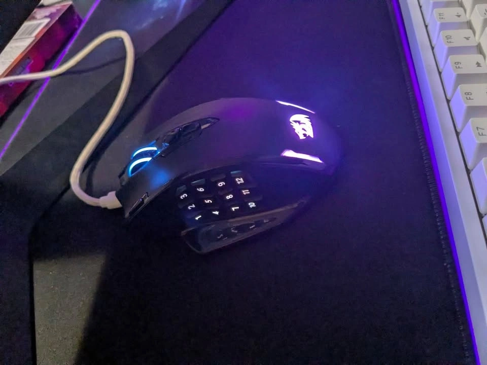 M09 impact elite 1000hz mouse MMO mouse but I removed the battery for weight reduction and added a few skates. Can put the battery in upon request. The mouse has a whole Arsenal of Buttons and can be customized via app.