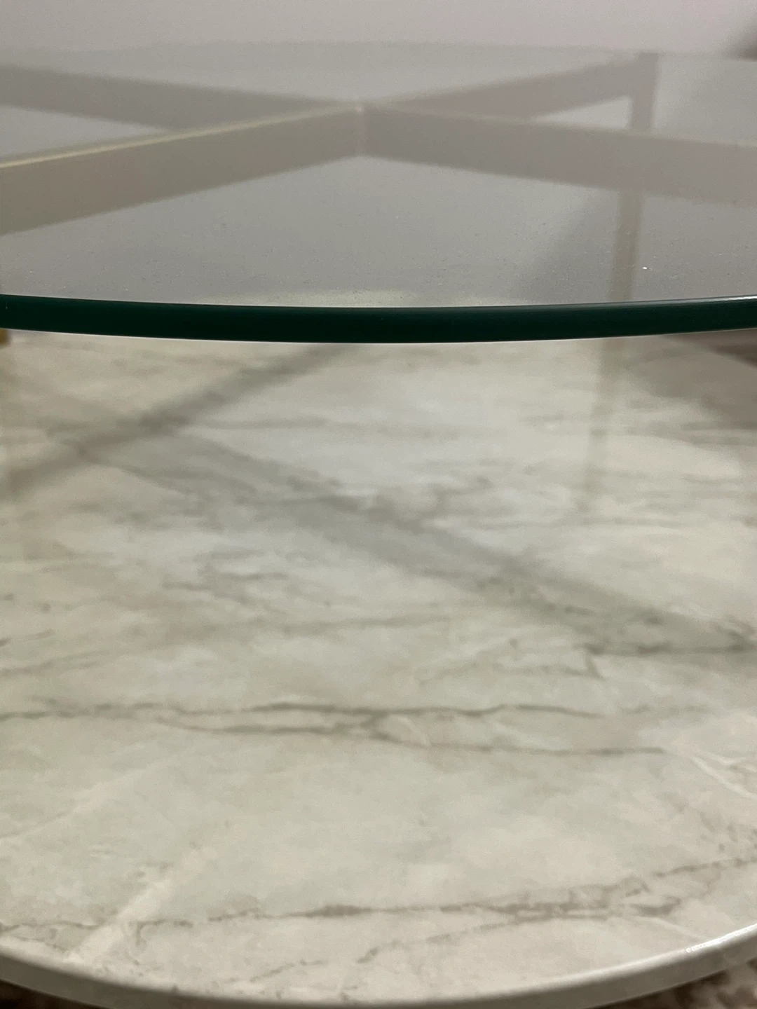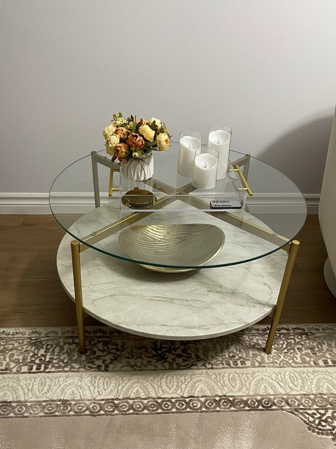 Round Glass Coffee Table with Marble Shelf
