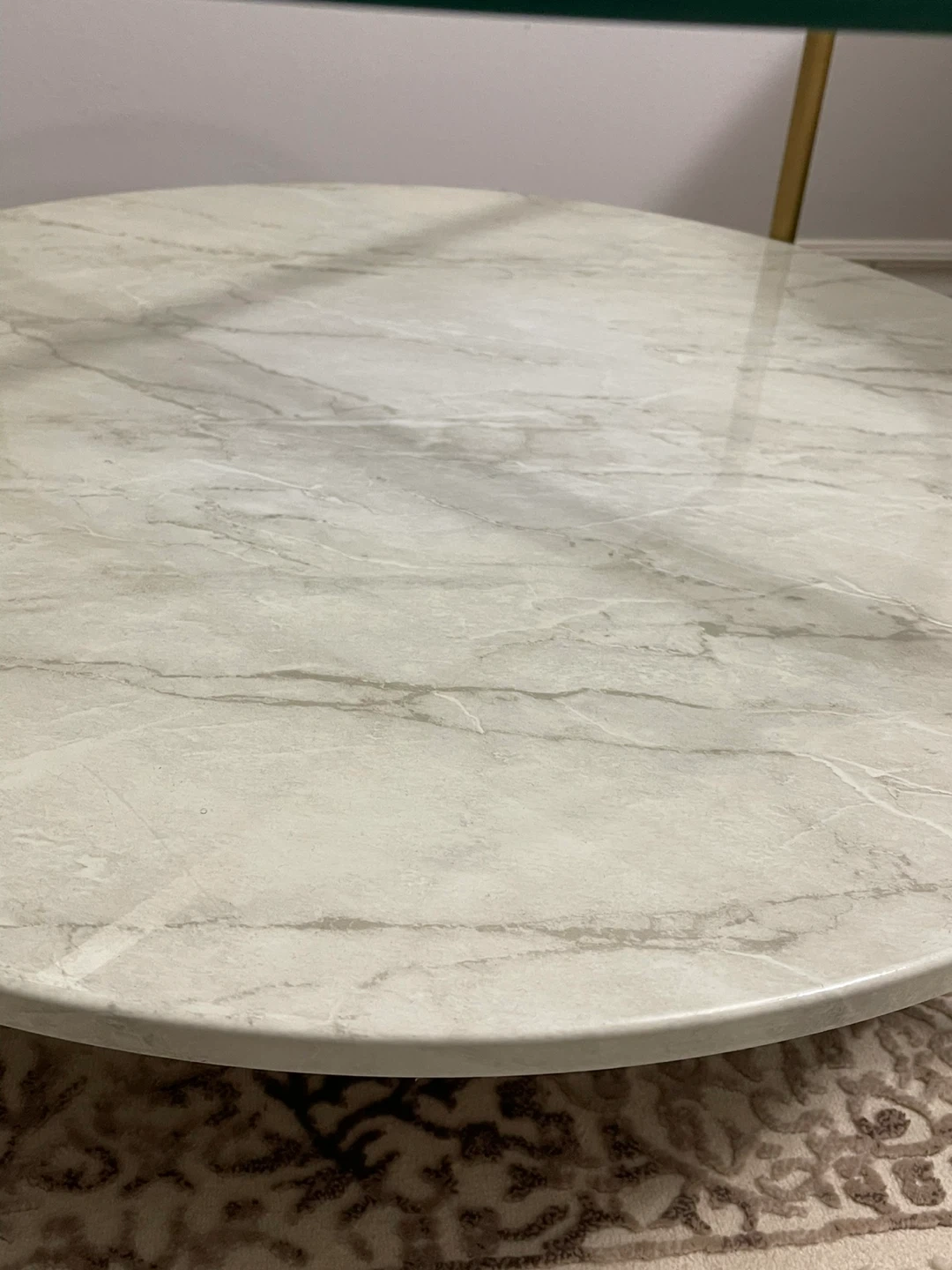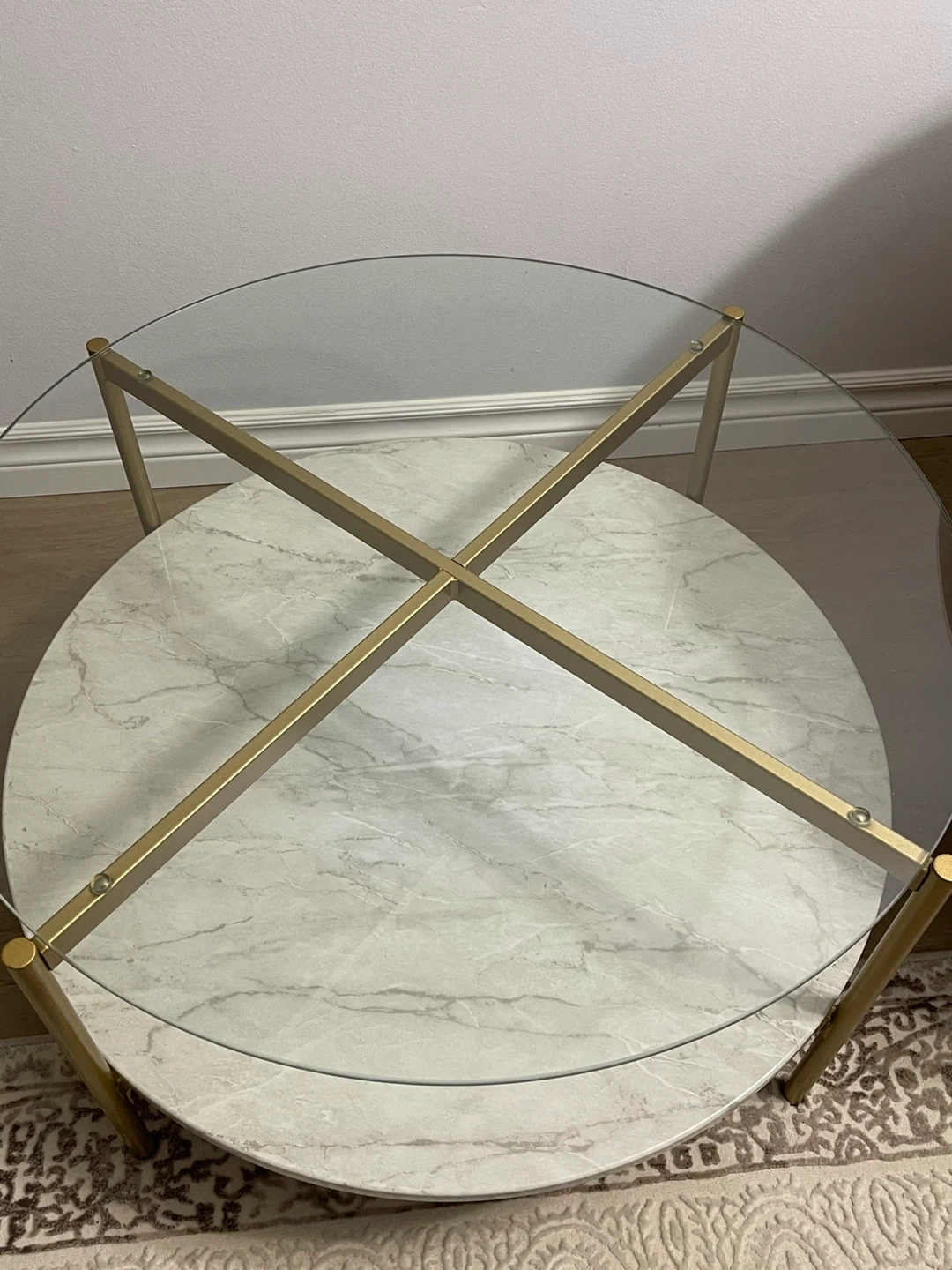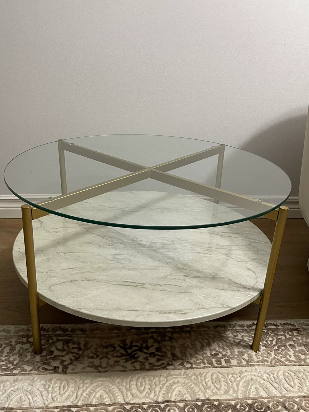 Selling a stylish round coffee table! It features a clear glass top and a faux marble shelf at the bottom. The frame is a sleek gold colour. It's in great condition and would be a lovely addition to any living room!