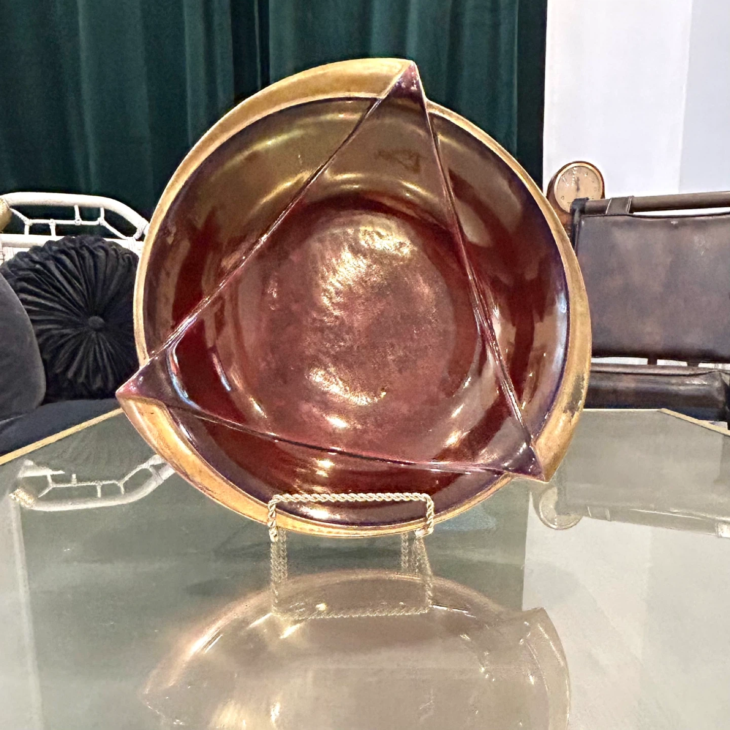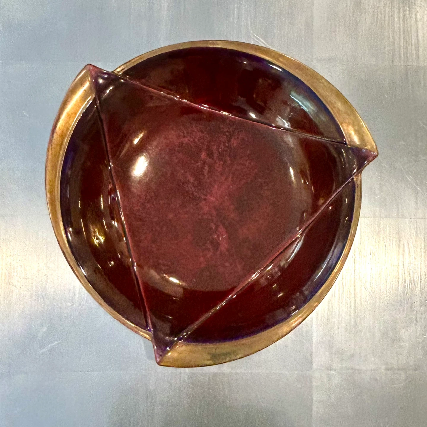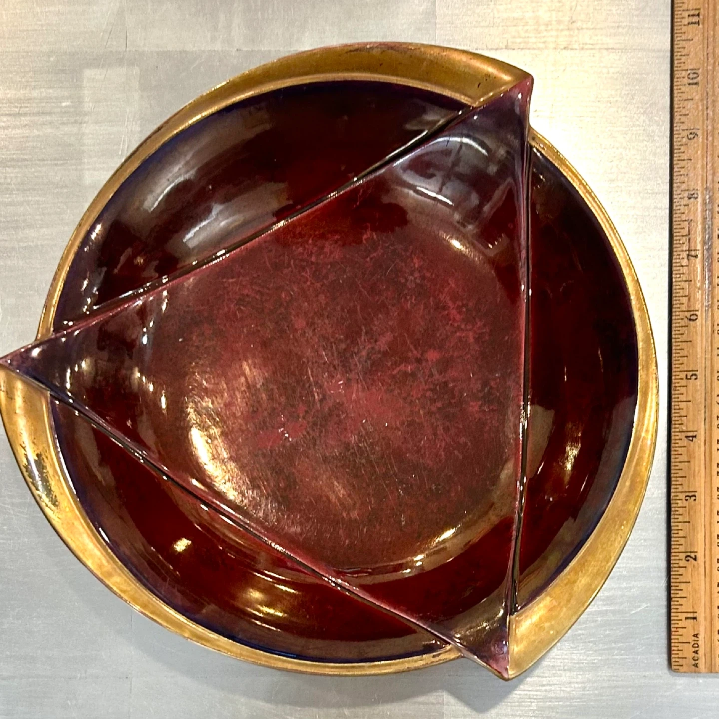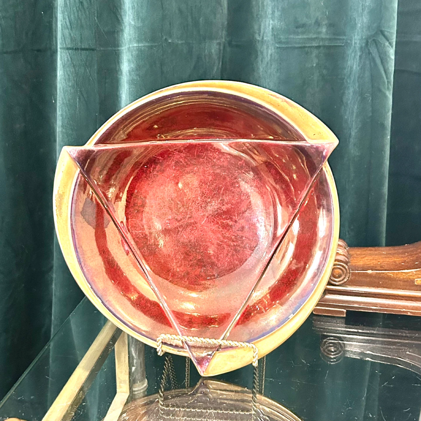 Authentic 1930s Carlton Ware Rouge Royale tri-lobed bowl, produced in Stoke-on-Trent, England during the height of the Art Deco period.