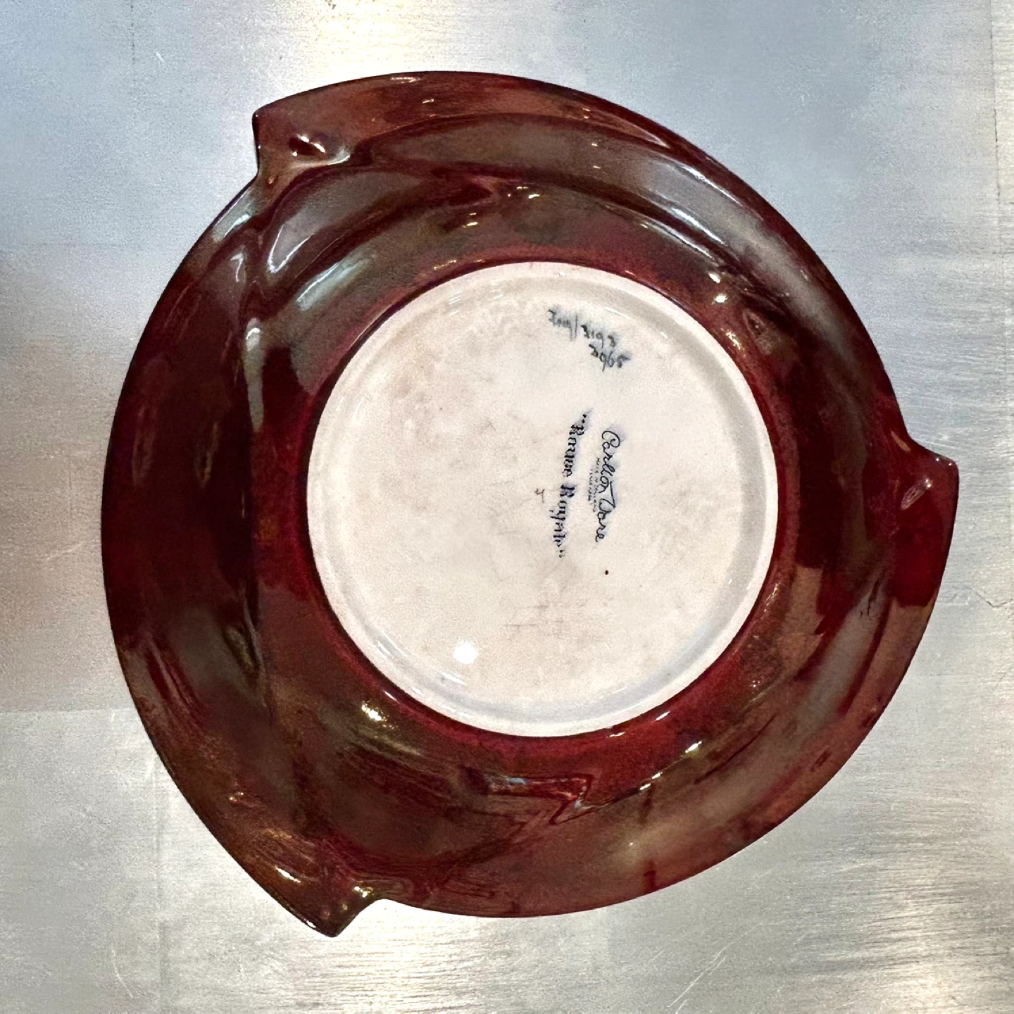 This piece features the highly desirable Rouge Royale glaze, prized for its deep oxblood red tones with subtle plum and black shading, finished with a hand-applied gilt rim. The sculptural three-section form is far less common than standard Carlton Ware bowls and was produced in limited numbers due to the difficulty of firing this glaze evenly.