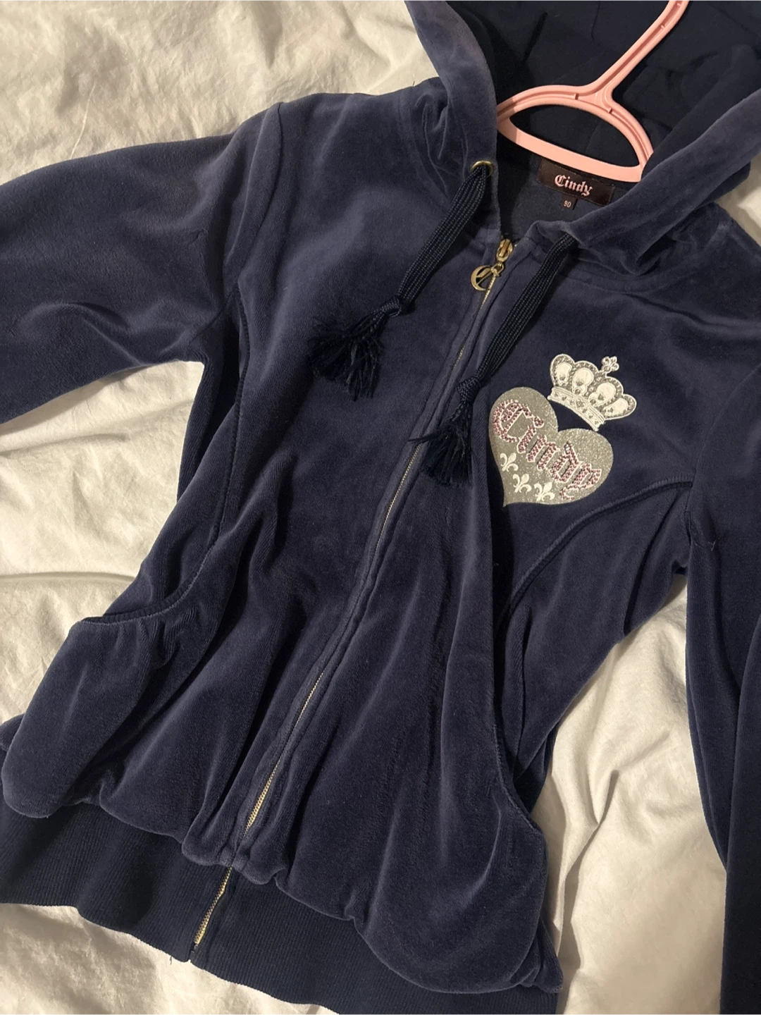 Selling a Cindy zip-up hoodie in a soft velour material. It's a size 90 and features a cute crown and heart design on the front and back. I’m selling this because it doesn’t fit me.