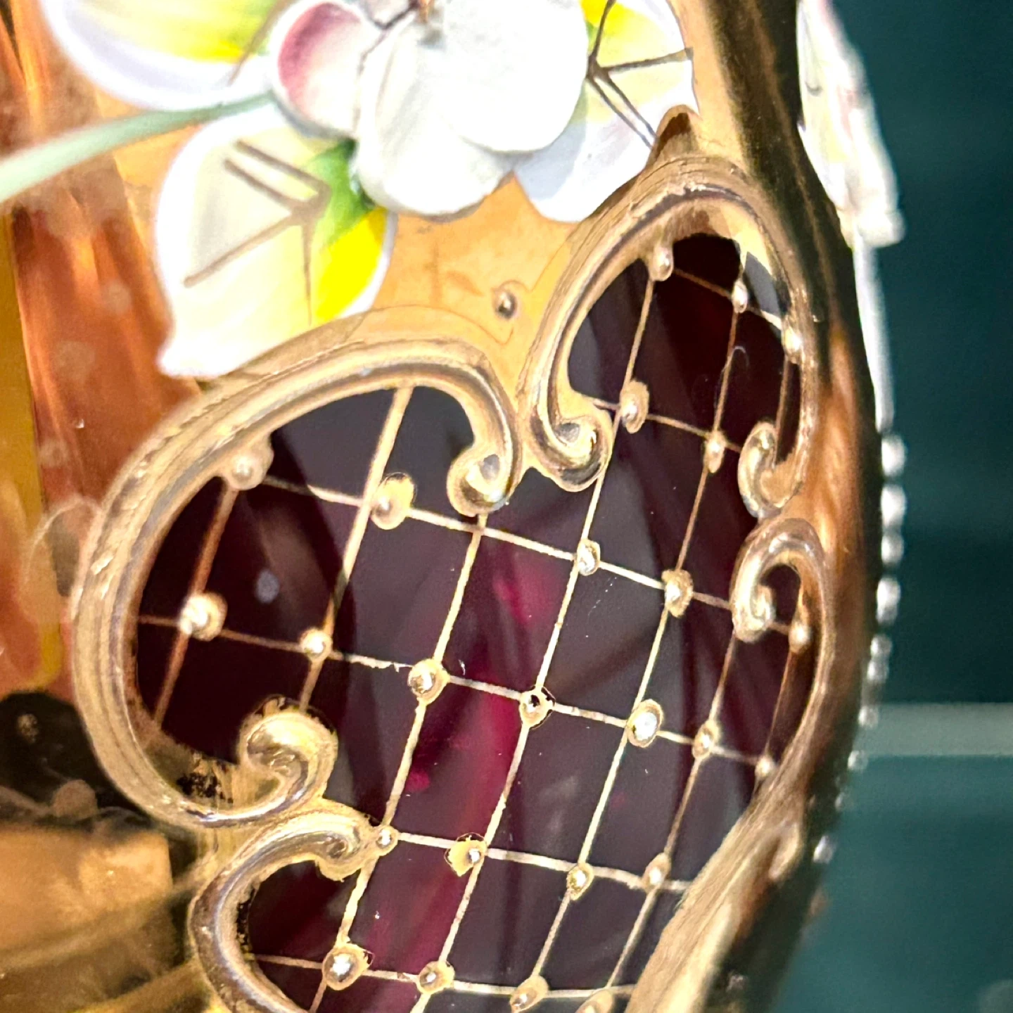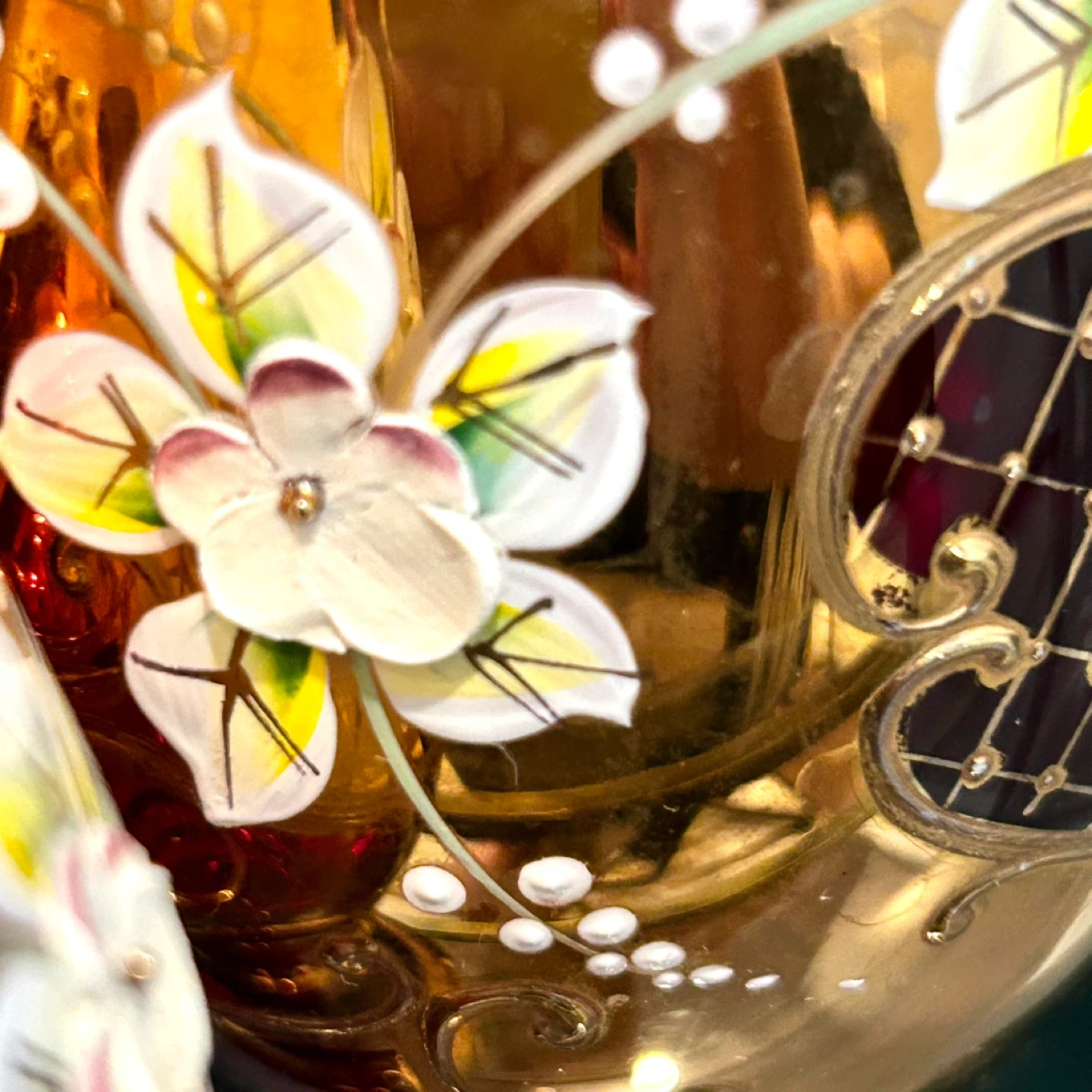 • Raised enamel flowers with pearl/berry accents