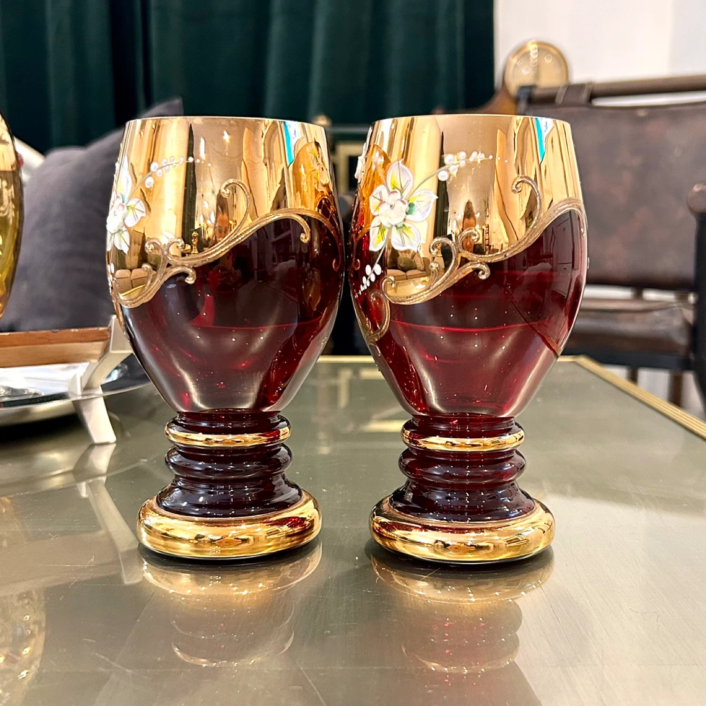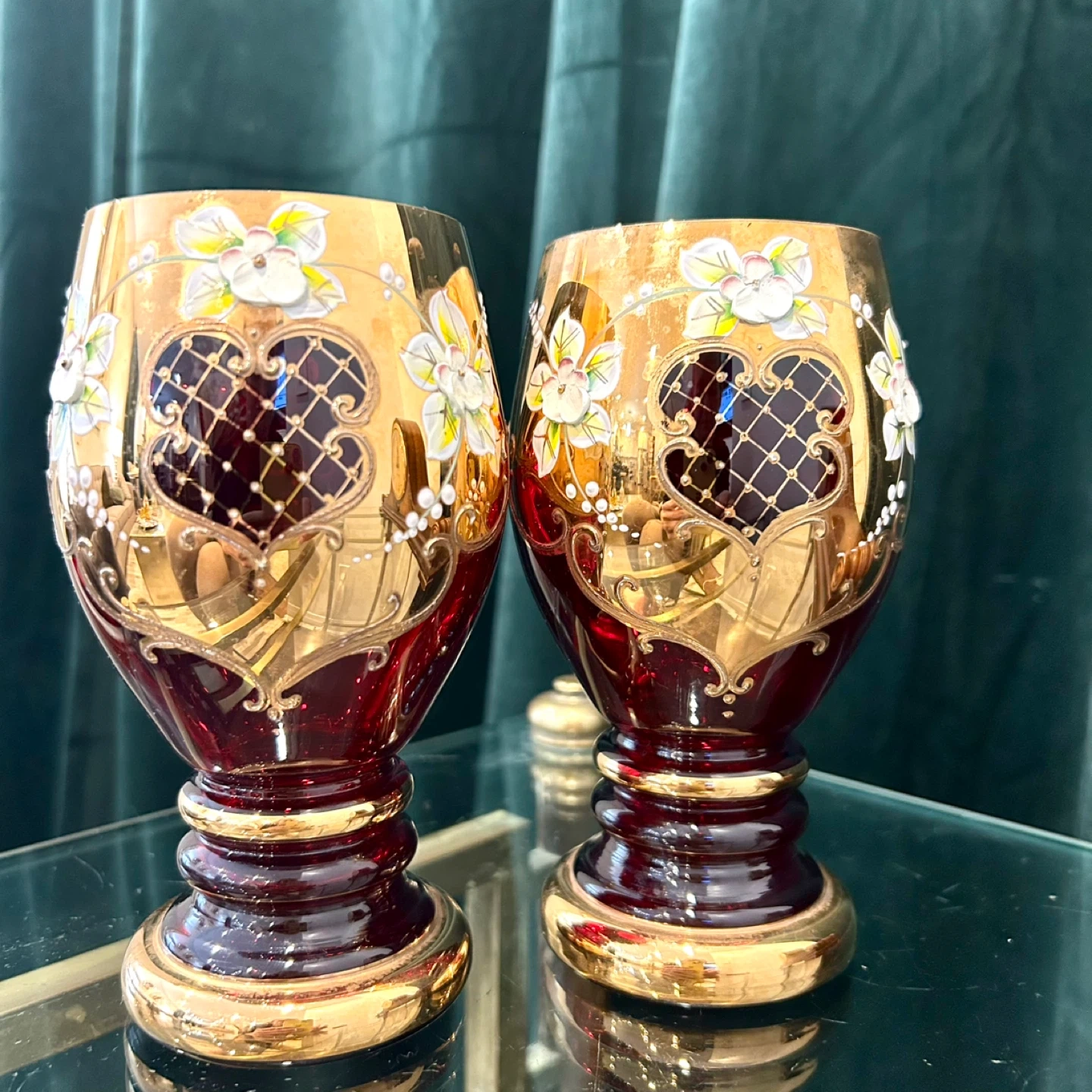 Antique Ruby Cranberry & Gold Enamel Heart Goblets (Pair)