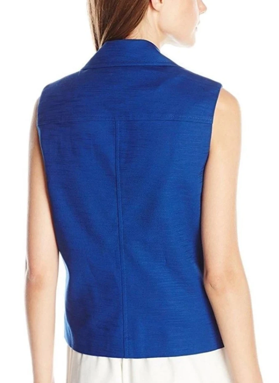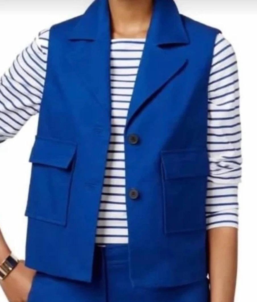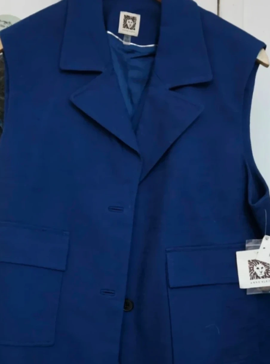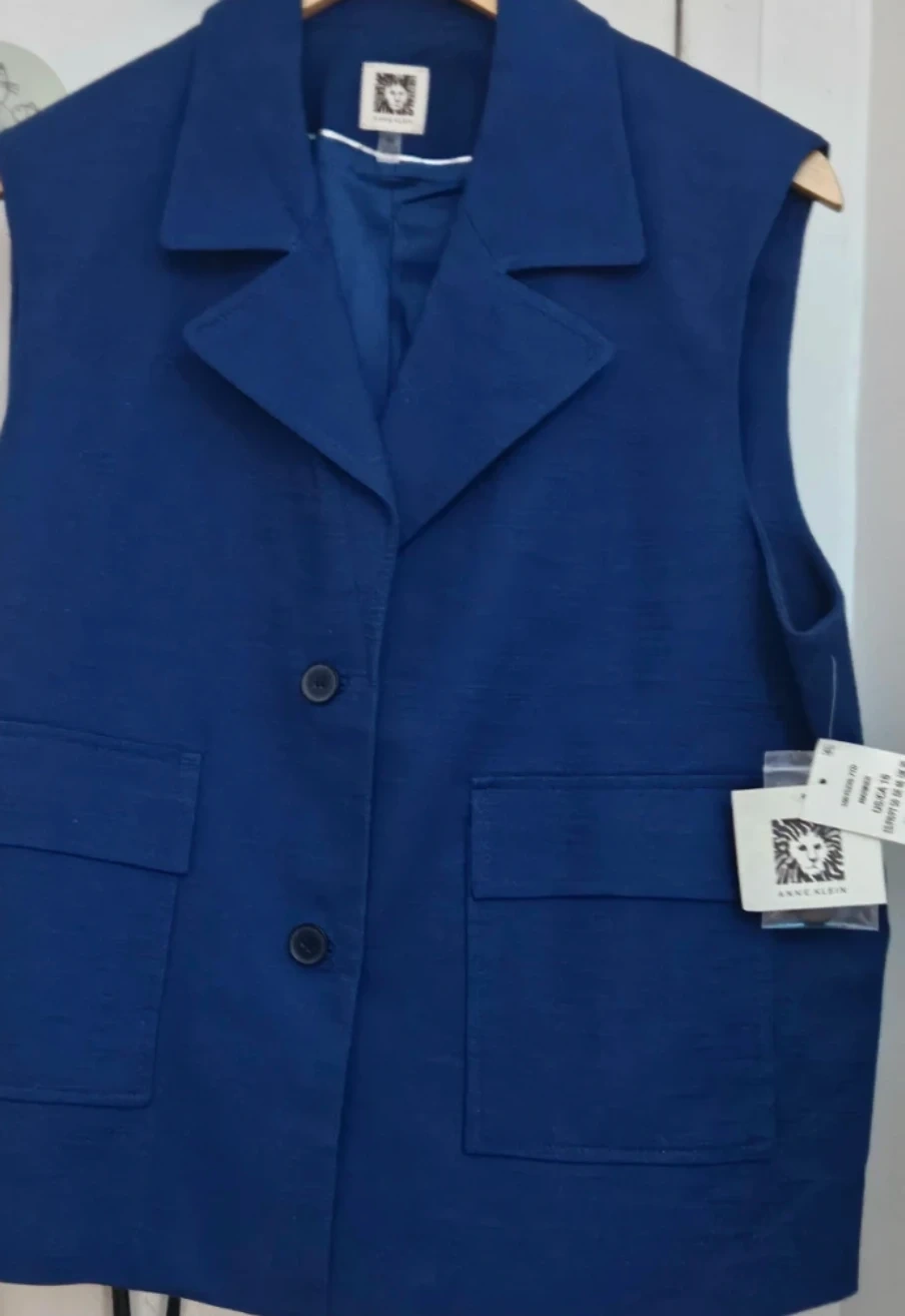 Anne Klein Mariner vest in a vibrant blue colour, size 16. This stylish vest features a classic design with functional pockets. Perfect for layering and adding a pop of colour to your outfit!