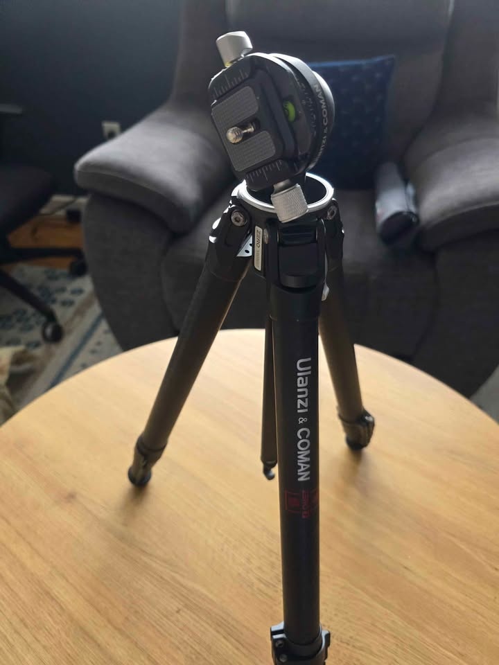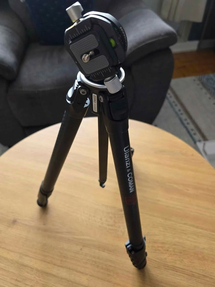 Super lightweight carbon fiber travel tripod with smooth ball head and Arca-Swiss quick-release plate. Very sturdy and perfect for cameras, phones, and travel shoots. Comes with original bag, strap, and box.